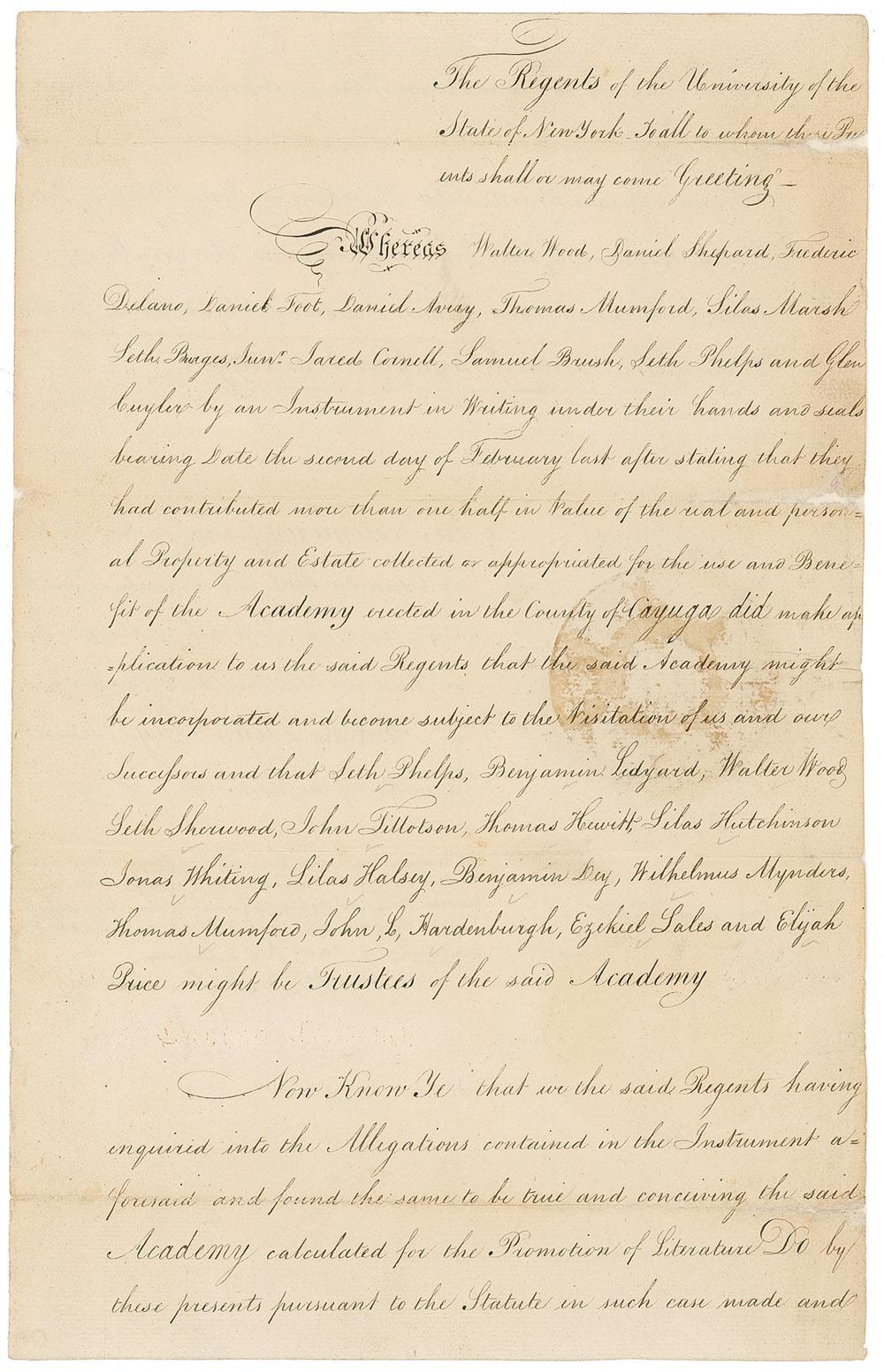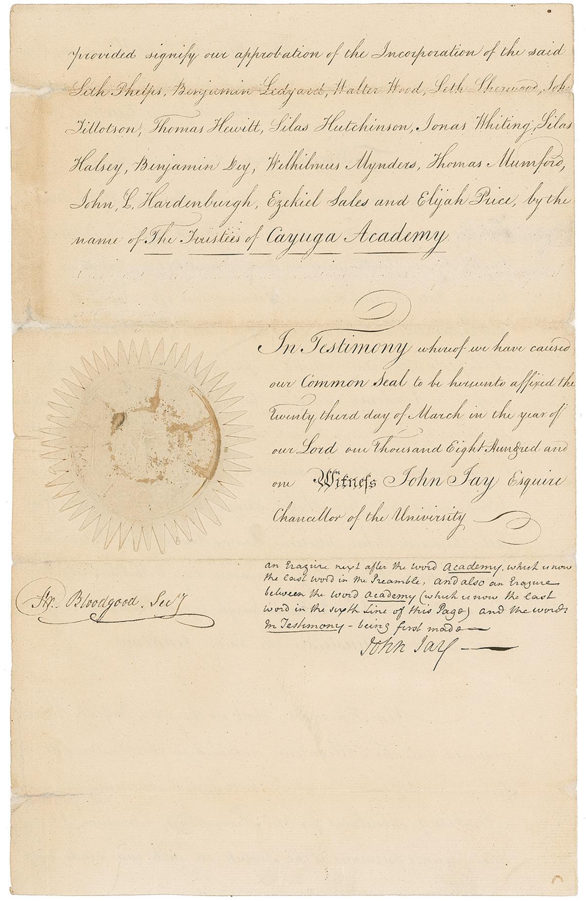 Manuscript DS, one page both sides, 9.25 x 14.75, March 23, 1801. Foundational document incorporating the charter of the Cayuga Academy. In part: “Whereas Walter Wood, Daniel Shepard, Frederic Delano…and Glen Cuyler by an Instrument in Writing under their hands and seals bearing Date the second day of February last after stating that they had contributed more than one half in Value of the real and personal Property and Estate collected or appropriated for the use and Benefit of the Academy erected in the County of Cayuga did make application to us the said Regents that the said Academy might be incorporated and become subject to the Visitation of us and our Successors…Now Know Ye that we the said Regents having enquired into the Allegations contained in the Instrument aforesaid and found the same to be true and conceiving the said Academy calculated for the Promotion of Literature Do by these presents pursuant to the Statute in such case made and provided signify our approbation of the Incorporation.” Before his signature, Jay adds a handwritten amendment reading, “An Erazure [sic] next after the word Academy, which is now the last word in the Preamble, and also an Erazure [sic] between the word Academy (which is now the last word in the sixth Line of this Page) and the words In Testimony - being first made.” In very good condition, with professional repairs to a couple partial separations along horizontal folds, scattered light toning and soiling, and mild handling wear. The paper seal is toned, but intact. Pre-certified PSA/DNA and RRAuction COA.