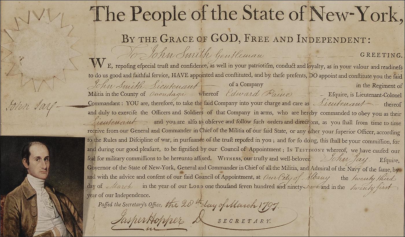 American statesman (1745–1829) who served variously as President of the Continental Congress, diplomat, and, from 1789 to 1795, first Chief Justice of the Supreme Court. Partly-printed DS, one page, 13 x 7.5, March 23, 1797. Jay, as governor of New York, appoints John Smith, a Lieutenant in the militia of Onondaga County. Signed on the left side in black ink by Jay, and countersigned by Secretary Jasper Hopper. Matted to an overall size of 17.75 x 12.5. In very good condition, with some small separations and minor areas of paper loss along intersecting storage folds, scattered toning and foxing, and a small photo lightly affixed to lower left corner. Pre-certified PSA/DNA and RRAuction COA.