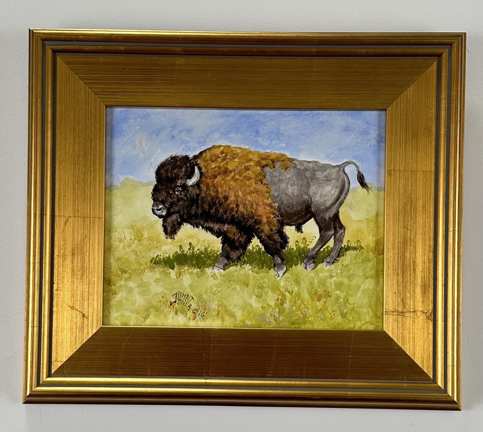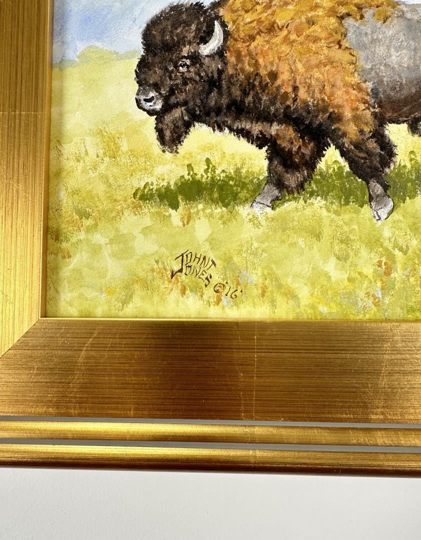 8" by 10" unframed. 12 7/8" by 15" framed. I don't remember a time when I wasn't playing with some kind of art. I think everyone has the innate ability to do masterworks. What sets an artist apart from the everyday person is just the interest factor. I have an intense interest in drawing, painting, and sculpting. I was born at Hobbs, New Mexico, in 1940. Hobbs was a fairly new oil boom town, moving into the modern world when World War II came along. My folks were raised in Oklahoma and Texas, and their folks were part of the homesteading and settling, and farming and ranching of the West. My grandfather, on my mother's side, homesteaded around Weed, New Mexico, when my mom was about 5 years old. World War I disrupted that, when granpas' brother had to go into the Army, leaving 'granpa' to prove up on two homesteads and watch out for both families. When he thought he was going to get called up too. He traded the homesteads for some mules and a wagon and moved both families back to Fort Worth. That is just a typical story of all of us raised in the west. Some of us lived in towns and some stayed on the farms and ranches. My dad worked as a cowboy, farmer, oil field worker, and sheet metal worker, and I don't know what all. He was in the Civilian Conservation Corps (CCC) and helped to plant wind rows and helped build a bridge and the trail in Grand Canyon. All I know is we moved a lot. My older brother was born in 1938 in Littlefield, Texas; my younger sister in Phoenix, Arizona; a younger brother in Albuquerque, New Mexico; and then another younger brother back in Hobbs. Some of my earliest memories are of making my toys out of clay. Then drawing all the time on whatever kind of paper I could get. I got hold of a roll of butcher paper when I was about 9 and remember drawing whole scenes right down the roll laid out on a cement floor. I remember making a lot of my own toys, whittling and carving them out of wood. I was sort of in different fantasy worlds, in that I made a lot of model airplanes and dressed in my western chaps and hat at the same time. And naturally I did adventure comic strips, especially when we were fighting the commies in Korea. The subject matter in my art was always varied, but the horse was always prominent. I 'dinked' with drawing and painting part time, as I discovered girls and cars, and sports and didn't know that a person could make a living doing artwork. After a stint in the Navy, I took a job with the Forest Service about 1970, and discovered Montana. I went in some Art Galleries in Kalispell, Montana, and saw that some guys were selling paintings. I said, "Heck, I can do that." So, I started doing paintings to sell, and started sculpting in wax. That started an adventure in Art, that continues today I learn from other Artists, books, TV shows, and anywhere that has something of interest. Mostly, I learn from trial and error. I think that masterpieces can be done in a closet, if that is the only space you have. But, I prefer to have a nice studio. I sometimes work on a series of paintings. Right now, I am living in Lincoln, Nebraska, with my true love, and have a nice studio. As I get a little older, I am having to narrow down my subject matter. I like the Old West Subjects best of all, but we aren't that far removed from the "Old West". So, I imagine that I will continue to do a mixture of old and new west, and anything with horses. I plan to do a series on the early longhorn cattle drives, and that may happen, if I can keep from straying too far. A few years ago, I went to Montana to do a series on the longhorn, and wound up doing buffalo hunts and Indians attacking stagecoaches. But most everyone up there wanted me to do packer scenes, so I did a lot of packers and cowboys in slickers.