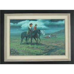 John Jones. Oil on Canvas. "Night Riders." 24" x 36". signed lower right. Estimate $600 - $800.