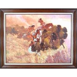 John Jones. Oil on Canvas. "Buffalo Hunt." 30" x 40". signed lower right. Estimate $800 - $1,000.
