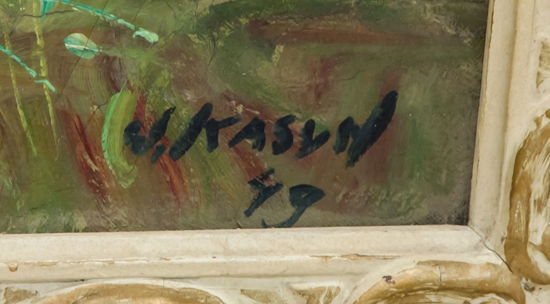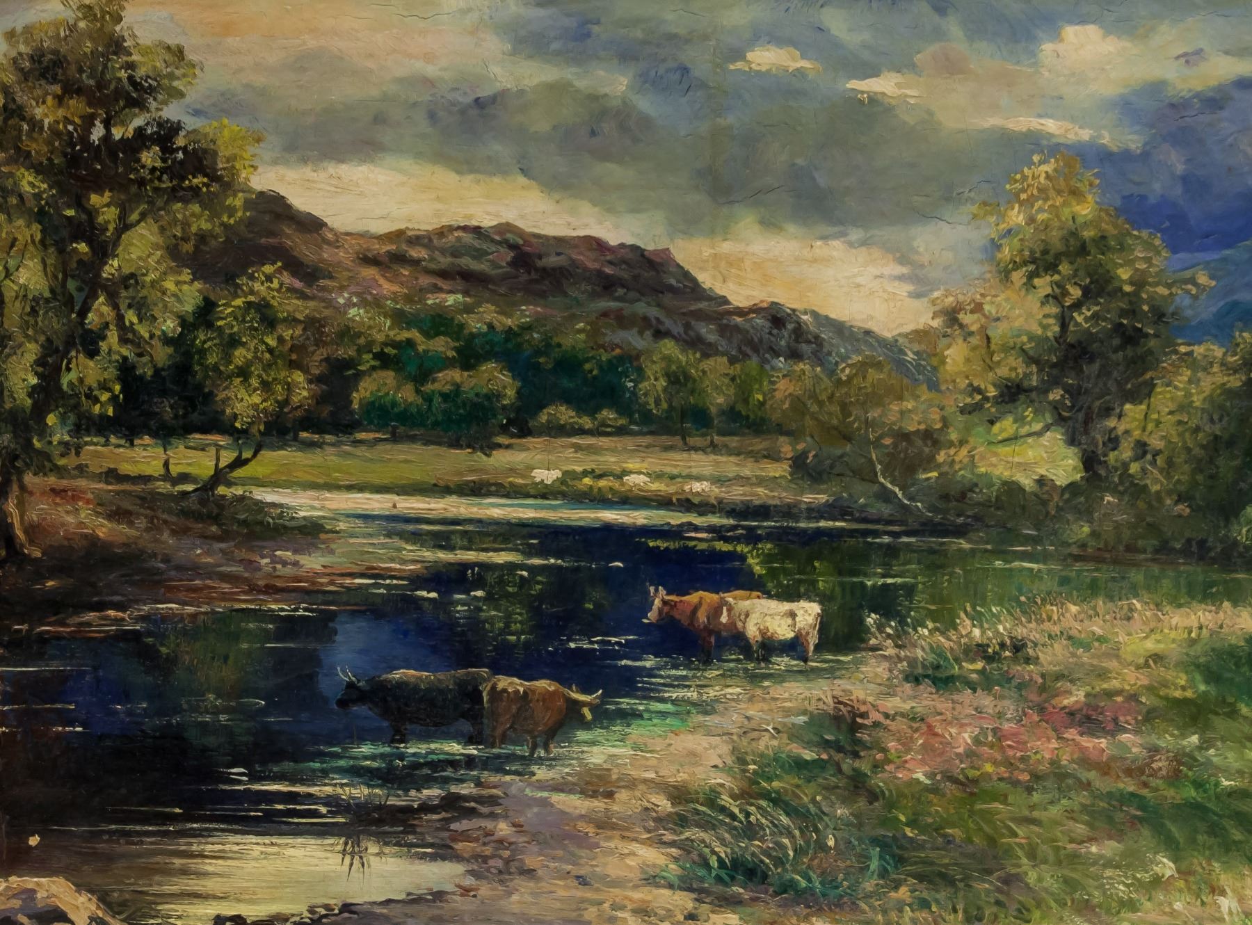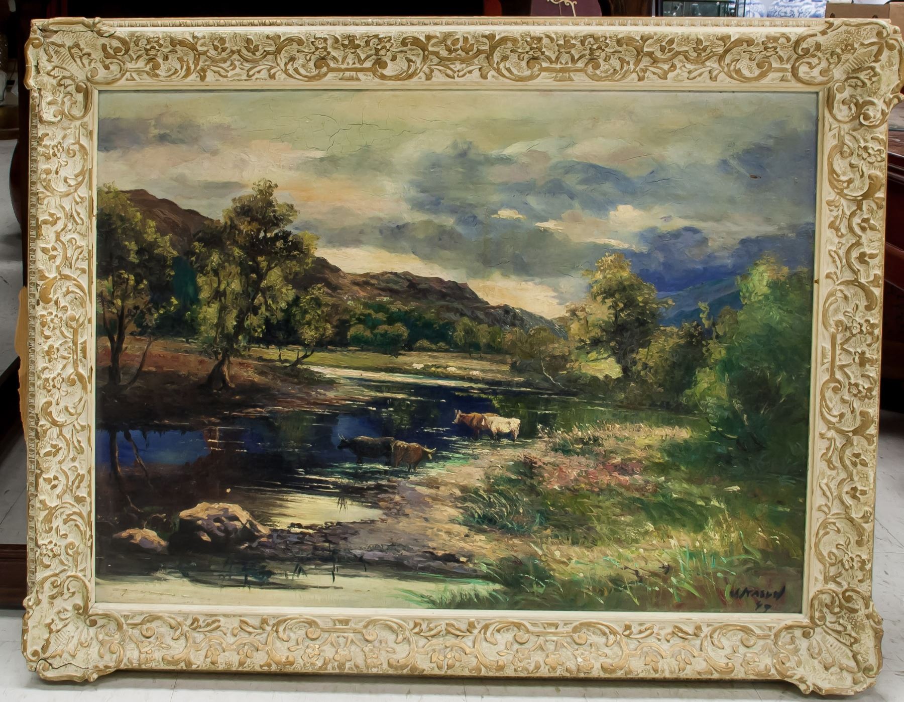 Landscape painting of mountain, river and cows; oil on board; framed; lower right corner signed and attr. John Kasyn (1926-2008), Poland-born Canadian painter, member of the Ontario society of Artists in Water colour and received the Gold Medal at the Annual Exhibition of the Canadian Society of Painters in Water colour of London, Ontario in 1966; dated 1949; large 21.5 inch x 30 inch