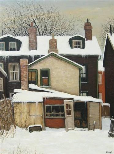 <B>Artist: </b>John Kasyn OSA, CSPWC (Canadian, 1926 - )<BR><b>Title:</b>Seaton Street yard in early winter, 1982<BR><B>Medium:</B>Oil on masonite with Lucite 44<BR><B>Size:</B>24" x 18"<BR><B>Signed:</b>Lower right
