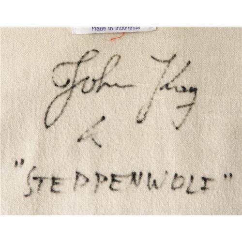 <B>John Kay Autographed Steppenwolf Tour Jacket.</B></I> A black satin tour jacket, circa 1982, with black-and-white trim and large "John Kay Steppenwolf" logo printed on the back. In Excellent condition.<I>From the Robert Johnson Memorabilia Collection.</B></I><BR><BR><b>Shipping:</b> Clothing, Costumes & Jerseys (<a target="_blank" href="http://www.heritageauctions.com/common/shipping.php">view shipping information</a>)
