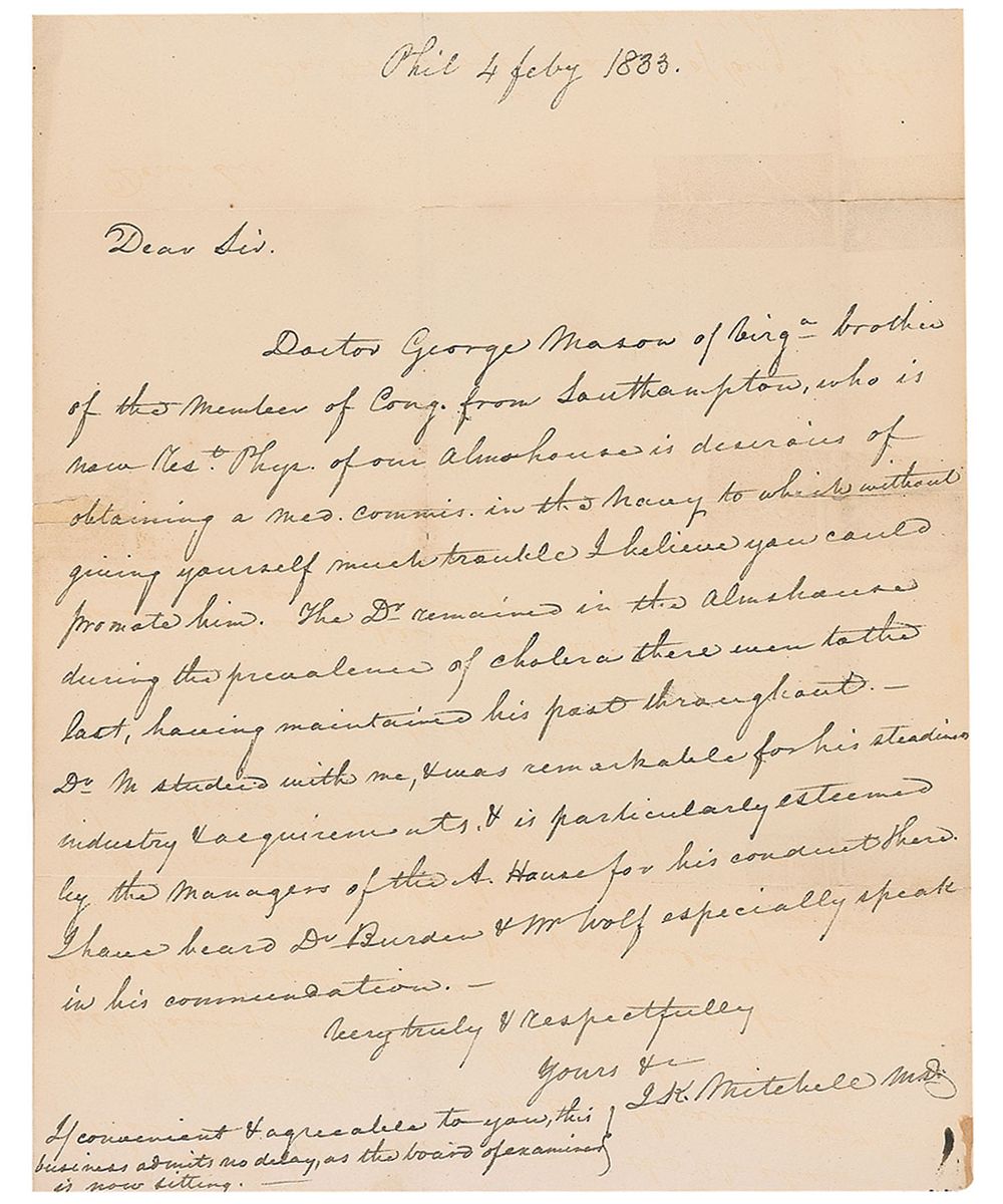 Physician and scientist (1798–1858). ALS signed “J. K. Mitchell MD,” one page, 7.75 x 9.75, February 4, 1833. Letter to Congressman Joel Sutherland. In part: “Doctor George Mason…is desirous of obtaining a med. commission in the Navy to which without giving yourself much trouble I believe you could promote him. The Dr. remained in the Almshouse during the prevalence of cholera there even to the last, having maintained his post throughout.” Mitchell also pens a brief postscript and reverse of second integral page bears an address panel in another hand. Intersecting folds, one through a single letter of signature, a couple tape repairs to small separations on reverse, some mild toning, and paper loss to second page, otherwise fine condition.