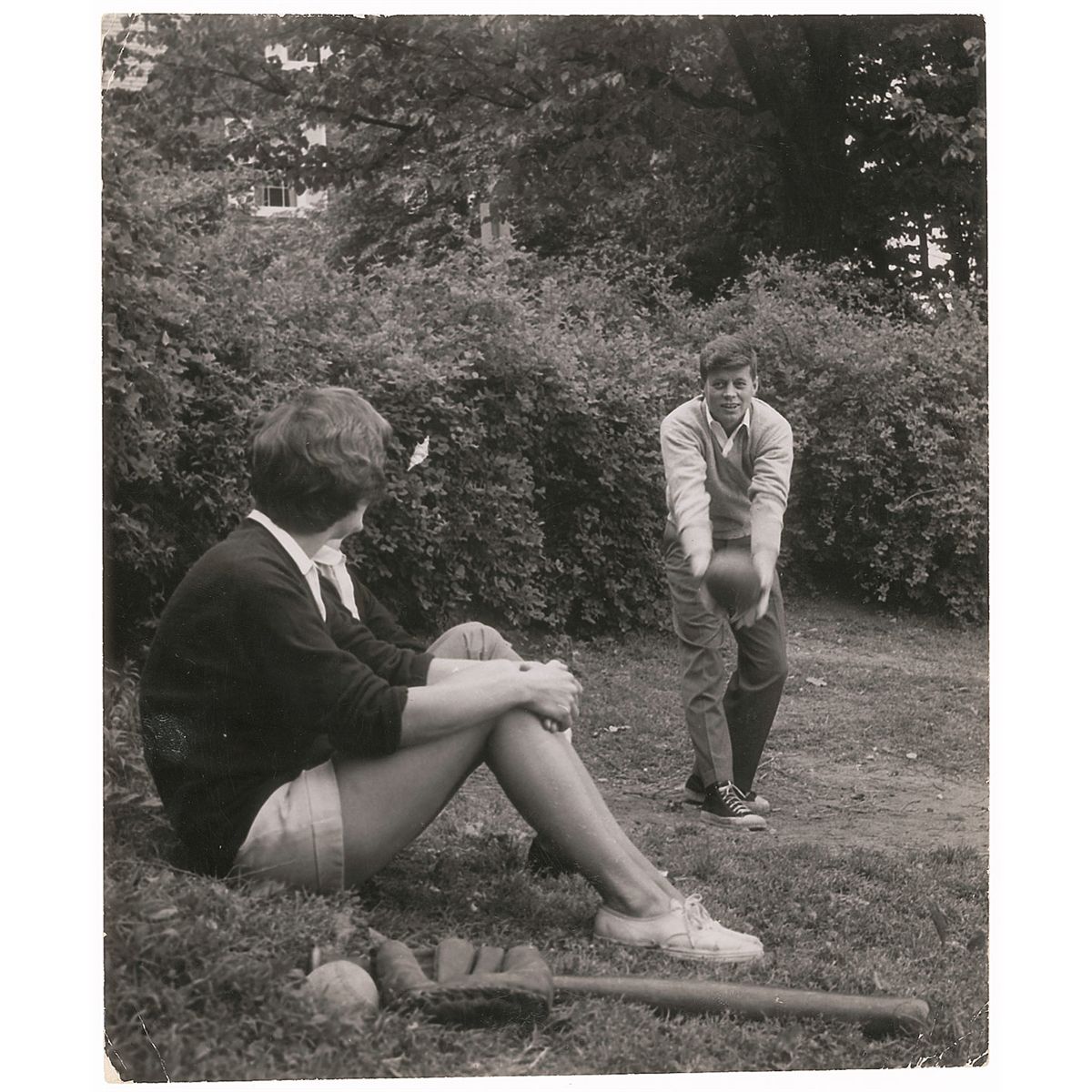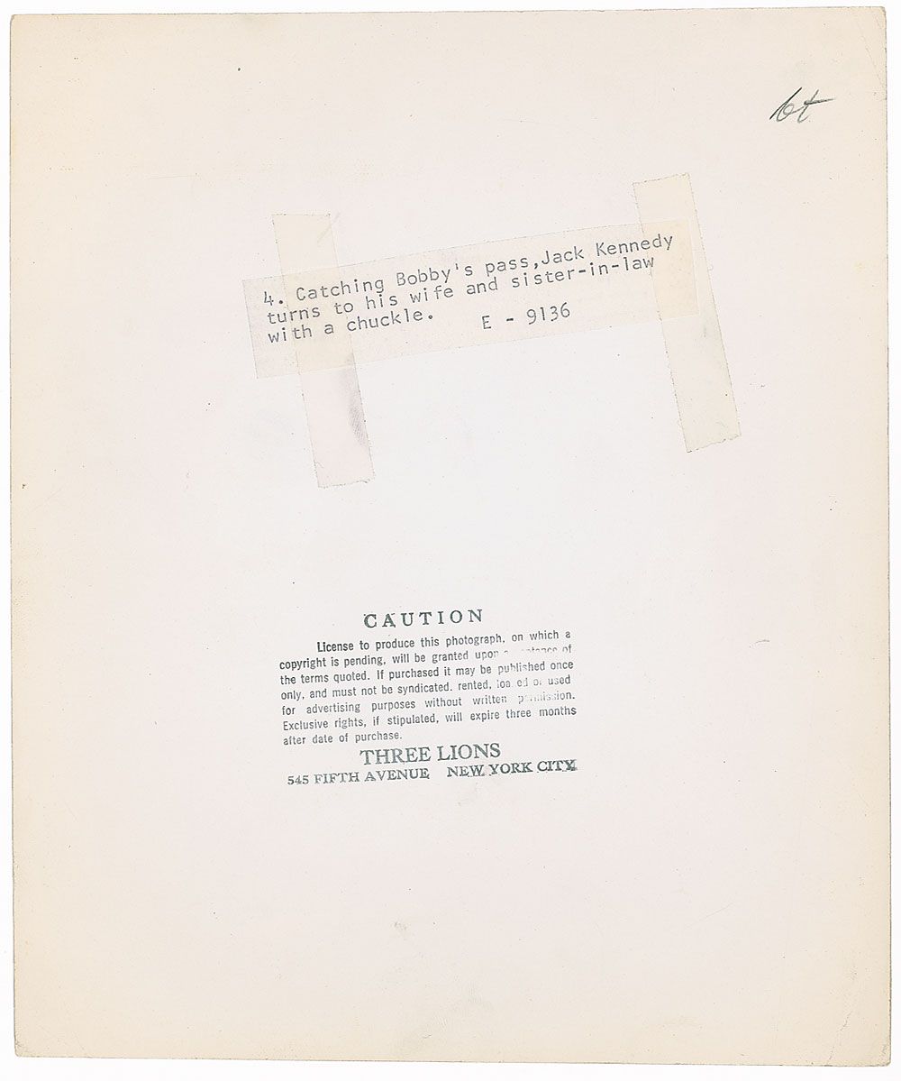 Original first-generation glossy 7.75 x 9.75 photo of John Kennedy leaning forward catching a football thrown off-camera by his brother Bobby as Ethel Kennedy looks on. Reverse of photo bears a Three Lions Inc. stamp and a small affixed typed caption. In fine condition, with some scattered light edge and corner creases. Published in Camelot at Dawn, Johns Hopkins University Press, 2001. Photo rights: The Lowenherz Collection of Kennedy Photographs, Friedheim Library and Archives, the Peabody Institute of The Johns Hopkins University, Orlando Suero, photographer.
