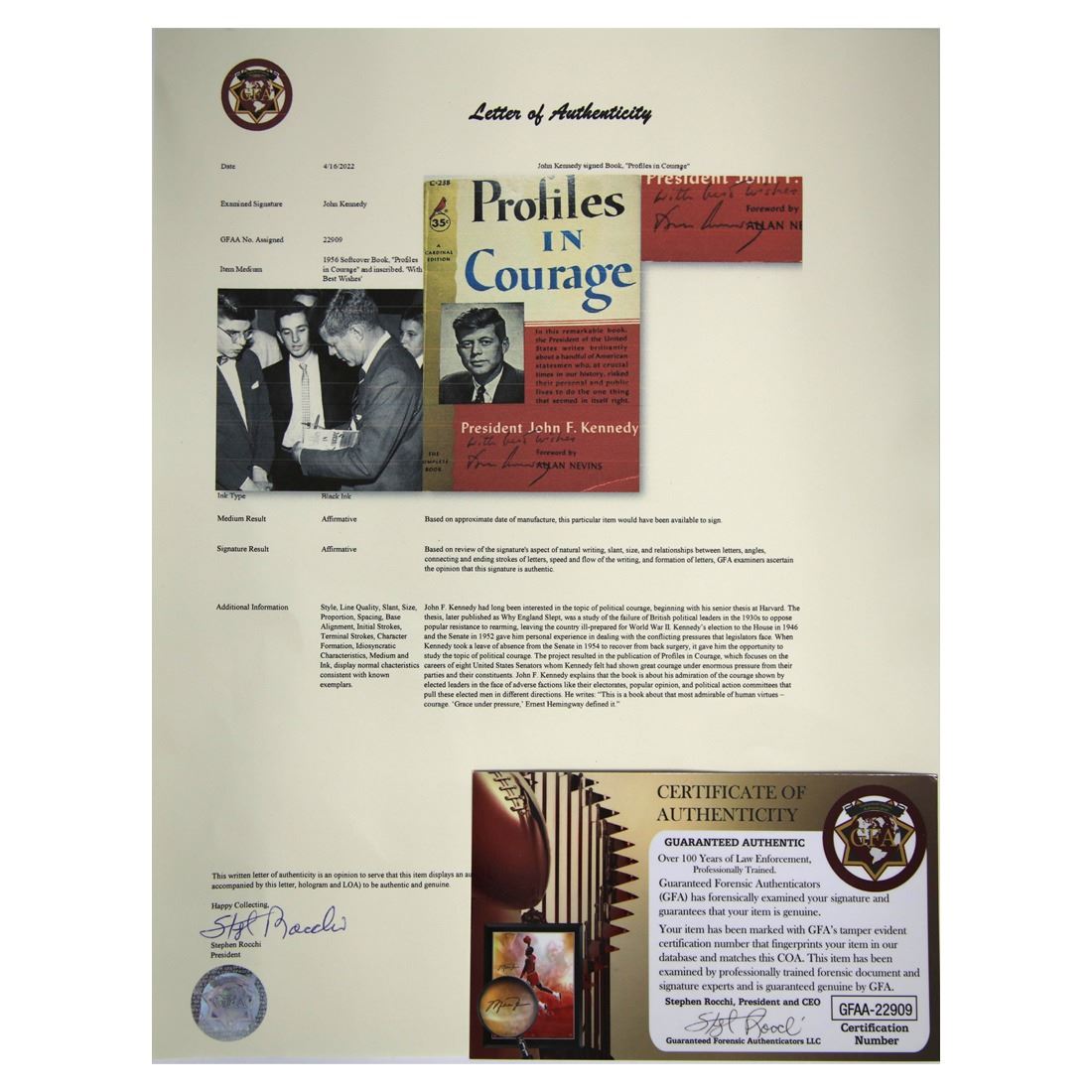 John Kennedy (May 29, 1917 – November 22, 1963) signed softcover book “Profiles in Courage.” Signed in black ink and inscribed, ‘With Best Wishes.’ When John Kennedy took a leave of absence from the Senate in 1954 to recover from back surgery, it gave him the opportunity to study the topic of political courage. The project resulted in the publication of Profiles in Courage, which focuses on the careers of eight United States Senators whom Kennedy felt had shown great courage under enormous pressure from their parties and their constituents. In the preface to Profiles in Courage, Senator Kennedy discusses the “problems of political courage in the face of constituent pressures, and the light shed on those problems by the lives of past statesmen.’’ John F. Kennedy explains that the book is about his admiration of the courage shown by elected leaders in the face of adverse factions like their electorates, popular opinion, and political action committees that pull these elected men in different directions. He writes: “This is a book about that most admirable of human virtues – courage. ‘Grace under pressure,’ Ernest Hemingway defined it.” Comes with a Letter of Authentication from Guaranteed Forensic Authenticators (GFA), along with the GFA guarantee of authenticity.