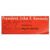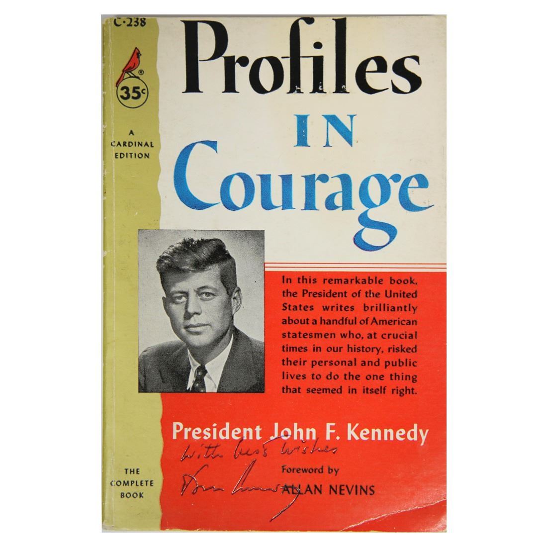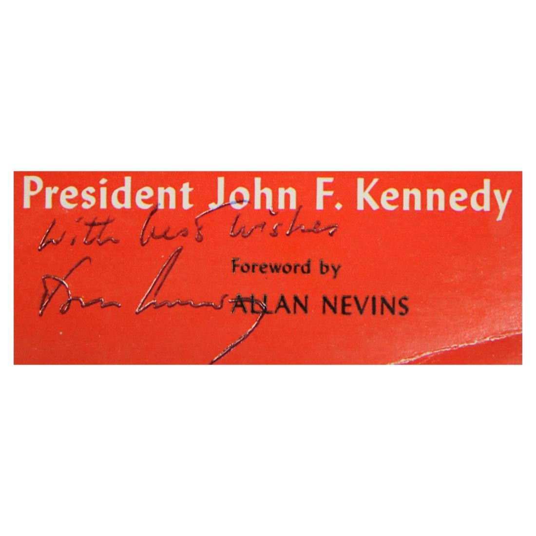 John Kennedy (May 29, 1917 – November 22, 1963) signed softcover book “Profiles in Courage.” Signed in black ink and inscribed, ‘With Best Wishes.’ When John Kennedy took a leave of absence from the Senate in 1954 to recover from back surgery, it gave him the opportunity to study the topic of political courage. The project resulted in the publication of Profiles in Courage, which focuses on the careers of eight United States Senators whom Kennedy felt had shown great courage under enormous pressure from their parties and their constituents. In the preface to Profiles in Courage, Senator Kennedy discusses the “problems of political courage in the face of constituent pressures, and the light shed on those problems by the lives of past statesmen.’’ John F. Kennedy explains that the book is about his admiration of the courage shown by elected leaders in the face of adverse factions like their electorates, popular opinion, and political action committees that pull these elected men in different directions. He writes: “This is a book about that most admirable of human virtues – courage. ‘Grace under pressure,’ Ernest Hemingway defined it.” Comes with a Letter of Authentication from Guaranteed Forensic Authenticators (GFA), along with the GFA guarantee of authenticity.