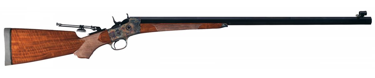 This is an example of a Remington Style Rolling Block Rifle made by Montana gunsmith John King. The rifle has a spirit level tunnel front sight and a tang peep sight. The top barrel flat is marked "E. REMINGTON & SONS. ILION. N.Y." and the bottom flat is marked "45-70". The bottom flat is also marked "John P. King/Kila, Montana" under the forearm. Pistol grip stock with checkered forearm and grip area, cheekpiece, casehardened forend tip and solid Hogue recoil pad.