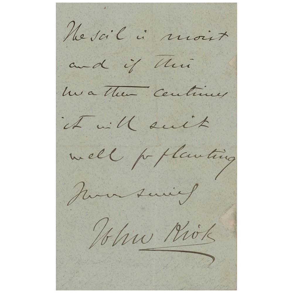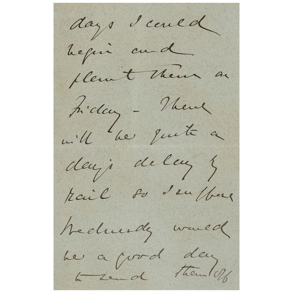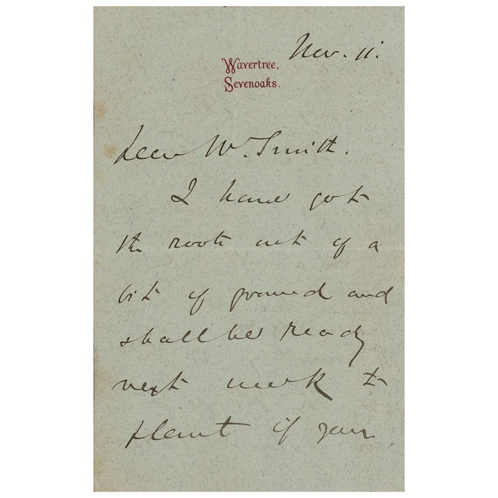 Physician, naturalist, companion to explorer David Livingstone, and diplomat (1832–1922) who worked to end the East African slave trade during his time as British administrator in Zanzibar. ALS, four pages on two adjoining sheets, 4.5 x 7, Wavertree letterhead, no date. Handwritten letter to Mr. Smith, in part: "I have got the roots out of a bit of ground and shall be ready next week to plant if you should find it convenient to send me the things we selected. I shall be from house on Wednesday & Thursday so that if the things come on either of these days I could begin and plant them on Friday…if the weather continues it will suit well for planting." In fine condition.