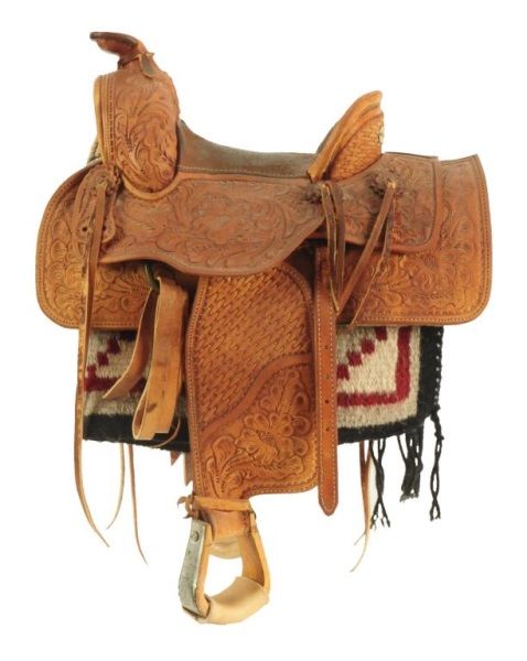 Fully carved and tooled CAA member John Kittleson crafted true salesman sample sized saddle. Mr. Kittleson created art in many mediums including wood. This saddle is expertly scaled and executed and took untold hours to construct. Well marked on the back of the cantle hand "Made by John H .Kittleson" Includes scale lariet and custom stand and miniature Navajo saddle blanket. Excellent condition.