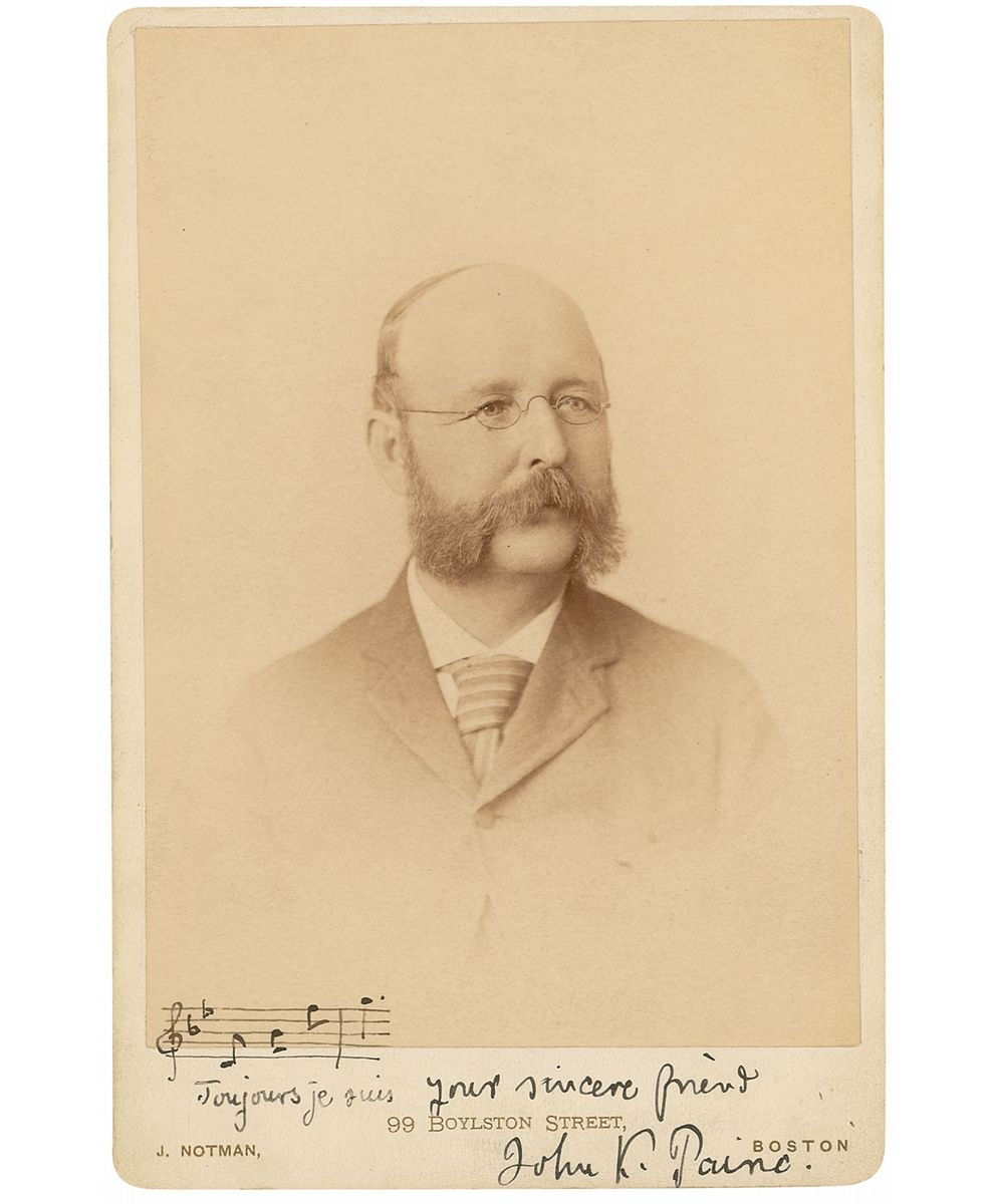 American composer (1839–1906) who was the first American to achieve fame for large-scale orchestral music. Original 4.25 x 6.5 cabinet photo by J. Notman of Boston, signed in the lower border in black ink, “Your sincere friend, John K. Paine,” adding two bars of music and lyrics to an unidentified work. In fine condition.