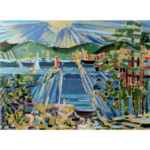 [Canadian b. 1913] UNTITLED (HARBOUR SCENE) Oil on board 18.25 x 25.25 in. Signed.
