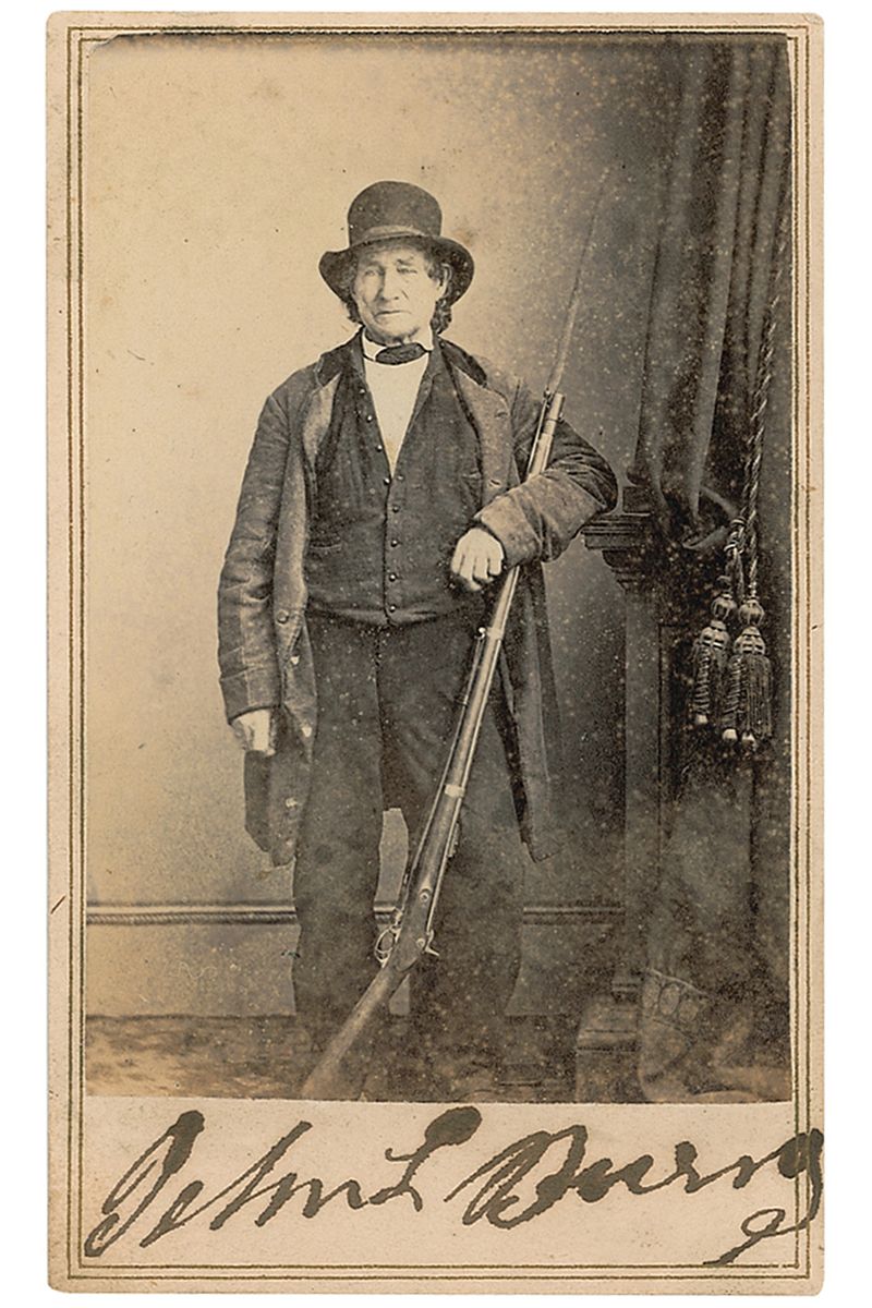 Gettysburg shoemaker, who upon seeing the Union soldiers march past his home, joined the Iron Brigade at the Battle of Gettysburg. He was wounded, but survived to become a national celebrity. Original 2.25 x 4 full-length carte-de-visite portrait of Burns posing with his Enfield rifle, backstamped "Published by E.&H.T. Anthony, 501 Broadway, New York, from Photographic Negative in Brady's National Portrait Gallery,” and signed on the front in the lower border in black ink, “John L. Burns.” Scattered light silvering to edges of image, and a bit of trivial toning and rubbing to image, otherwise fine condition. A scarce and boldly signed offering.