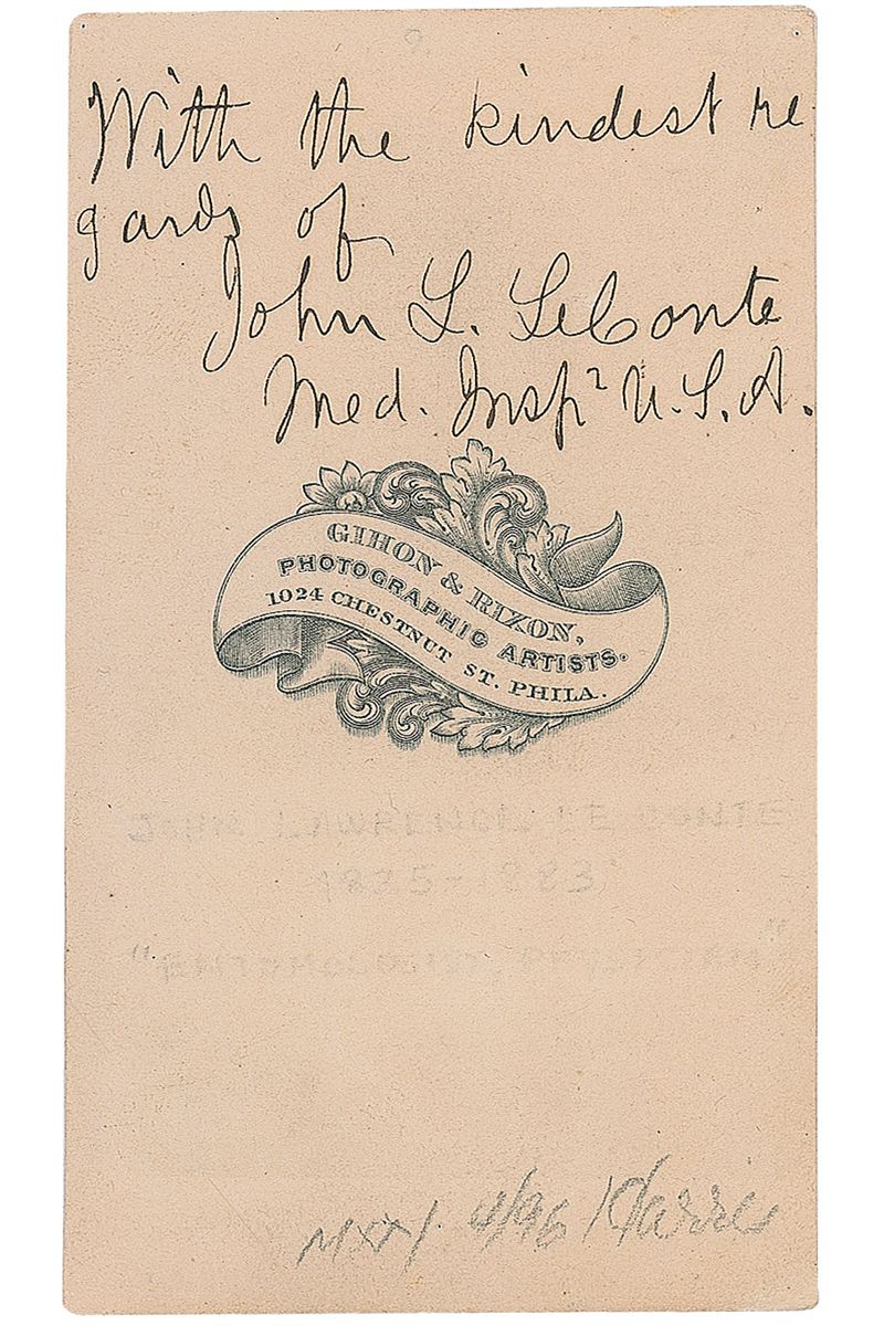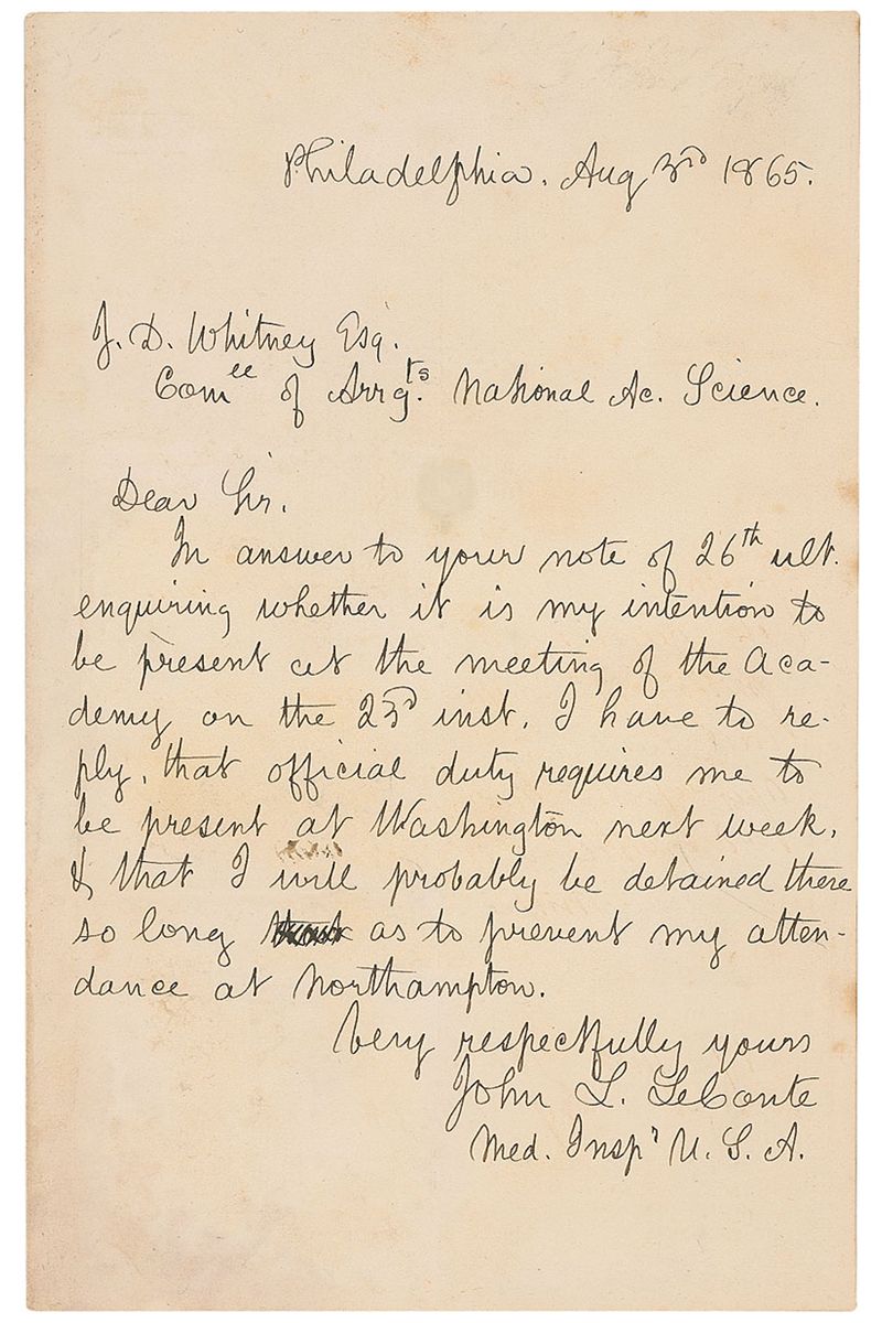 Tremendously important entomologist (1825–1883) responsible for classifying approximately half of the insect taxa known in the US; he volunteered for the Union medical corps during the Civil War. Two items: one original 2.25 x 4 carte-de-visite portrait of LeConte in uniform by Gihon and Rixon of Philadelphia, signed on the reverse in black ink, “With the kindest regards of John L. LeConte, Med. Insp’r U. S. A.”; and an ALS, one page, 5 x 8, Philadelphia, August 3, 1865. Letter to Josiah Whitney of the National Academy of Sciences, declining an invitation. In part: “I have to reply that official duty requires me to be present at Washington next week.” In overall fine condition, with slightly trimmed edges to the carte-de-visite and intersecting folds and some surface abrasions to the letter.
