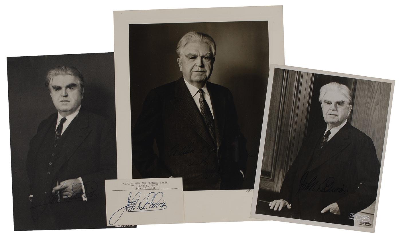 Organized labor leader (1880–1969) who served as president of the United Mine Workers of America from 1930 to 1960. Four items: three portraits, ranging in size from 8 x 10 to 11 x 14, each signed in fountain pen by Lewis with one inscribed; and a fountain pen signature on a 5 x 3 card. In overall fine condition. Accompanied by a 1958 letter from Lewis’s secretary acknowledging two of the signatures.