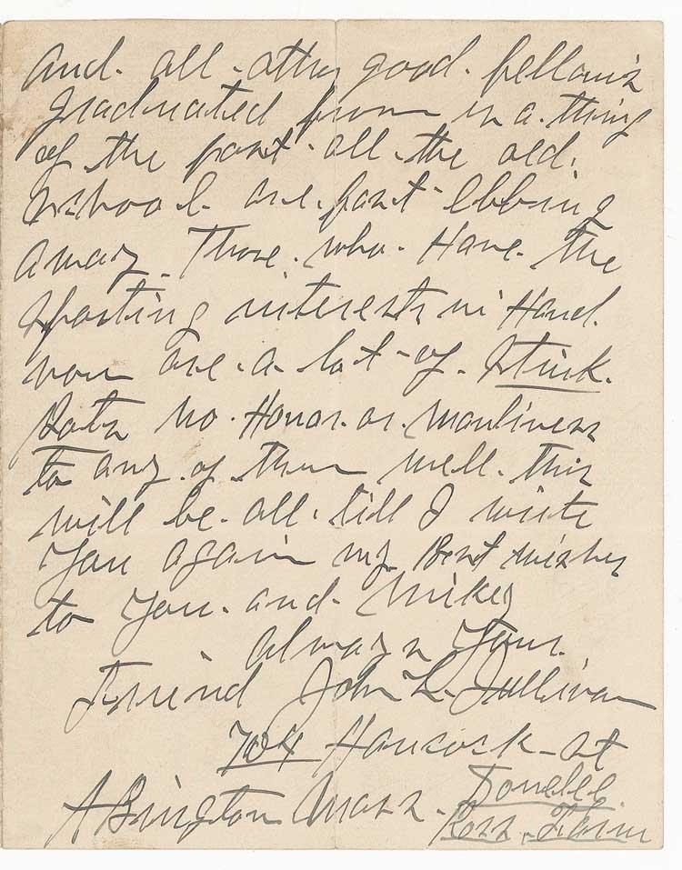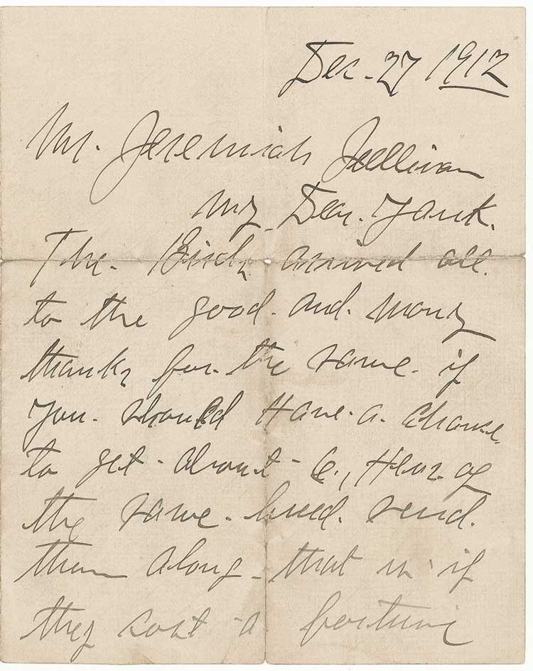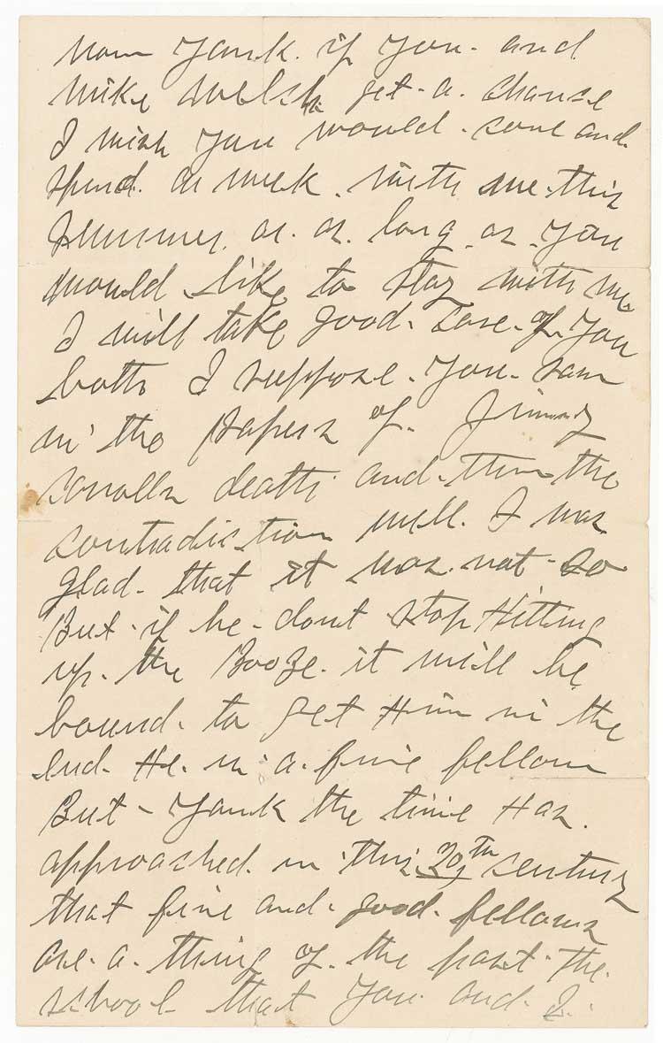Boxer known as the “Boston Strong Boy.” Fighting on turf and with bare knuckles, Sullivan became the heavyweight champion of the world under the London Prize Ring rules by defeating Paddy Ryan on February 7, 1882. Ten years later, on September 7, 1892, he lost the championship to James J. Corbett under the new Queensberry rules. ALS, four pages on two adjoining sheets, 5 x 6.5, December 27, 1912. Letter to Jeremiah Sullivan, addressed to “My dear Frank.” In full: “The bird arrived all to the good and many thanks for the same. If you should have a chance to get about 6 hens of the same breed send them along, that is if they cost a fortune. Now Frank, if you and Mike Welsh get a chance I wish you would come and spend a week with me this summer as as [sic] long as you would like to stay with me. I will take good care of you both. I suppose you saw in the papers of Jimmy Carrolls death and then the contradiction. Well I was glad that it was not so. But if he don’t stop hitting up the booze it will be bound to get him in the end. He is a fine fellow but Frank, the time has approached in this 20th century that fine and good fellows are a thing of the past. The school that you and I and all other good fellows graduated from is a thing of the past. All the old school are fast ebbing away. Those who have sporting interests in hand are a lot of stink pots. No honor or manliness to any of them. Well, this will be all till I write you again. My best wishes to you and Mikey.” After his signature, Sullivan adds his Massachusetts mailing address. In very good condition, with some partial separations and a couple of tiny holes along intersecting folds, light overall soiling, and a small stain affecting nothing.