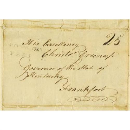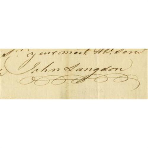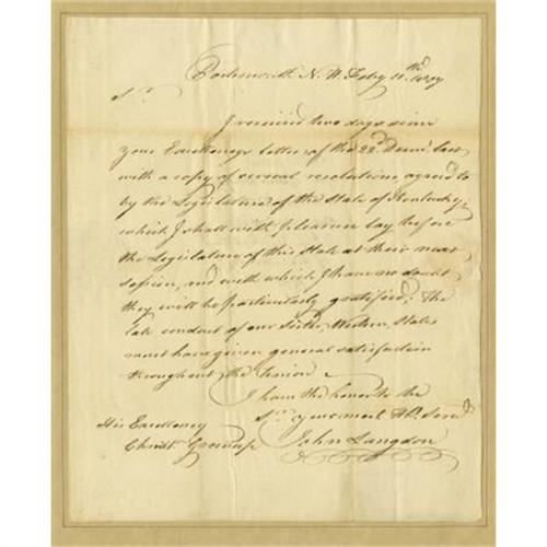 <B>John Langdon Autograph Letter Signed</B></I> "<I>John Langdon,</B></I>" one page, 8" x 9.75". Portsmouth, N.H., February 11, 1807. Integral leaf addressed by Langdon to "<I>His Excellency/ Christor. Greenup/ Governor of the State of/ Kentucky/ Frankfort</B></I>" with faint Portsmouth postmark. Signer of the Constitution John Langdon, as governor of New Hampshire, acknowledges receipt of Kentucky Governor Christopher Greenup's letter enclosing "<I>a copy of several resolutions agreed to by the Legislature of the State of Kentucky which I shall with pleasure lay before the Legislature of this Stateā¦The late conduct of our Sister Western States must have given general satisfaction throughout the Union.</B></I>" Christopher Greenup served as Governor of Kentucky from 1804-1808. Langdon was Governor of New Hampshire from 1785-1786, 1788-1789, 1805-1809, and 1810-1812. On April 6, 1789, John Langdon was elected the first President pro tempore of the Senate in order that the Senate might organize to count the electoral vote for president and vice president of the United States. John Adams wasn't sworn in as Vice President and President of the Senate until April 21, 1789. Tipped to an 8.75" x 11" sheet. Fine condition.<BR><BR><b>Shipping:</b> Flat Material, Small (<a target="_blank" href="http://www.heritageauctions.com/common/shipping.php">view shipping information</a>)