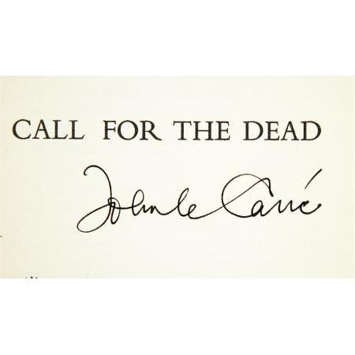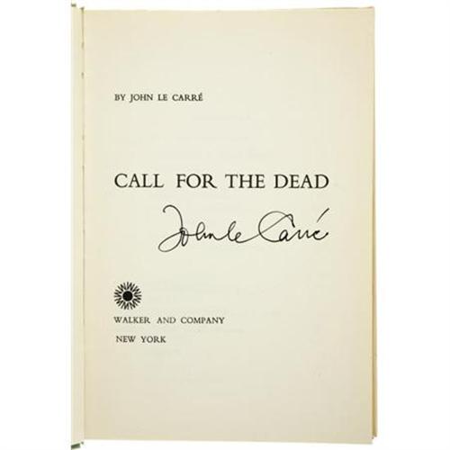 <B>John Le Carre: Signed </B></I><B><I>Call for the Dead</B></I></B></I> (New York: Walker and Company, 1962), first edition, 192 pages, green-cloth binding with blue lettering, (5.75” x 8.25”), dust jacket (in protective sleeve). Famous spy novelist John Le Carre was born David John Moore Cornwell in Poole, Dorset, England, in 1931. <I>A Call for the Dead</B></I>, his first novel, introduced the character of George Smiley, who returned in such later works as <I>A Murder of Quality </B></I>and <I>Tinker, Tailor, Soldier, Spy</B></I>. The title page is beautifully signed <I>“John le Carre”. </B></I>The book is in very good condition with some light staining at the bottom of the spine. The dust jacket is in fair condition with staining and pieces missing at the corners and top of the spine.<BR><BR><b>Shipping:</b> Books & Catalogs (<a target="_blank" href="http://www.heritageauctions.com/common/shipping.php">view shipping information</a>)