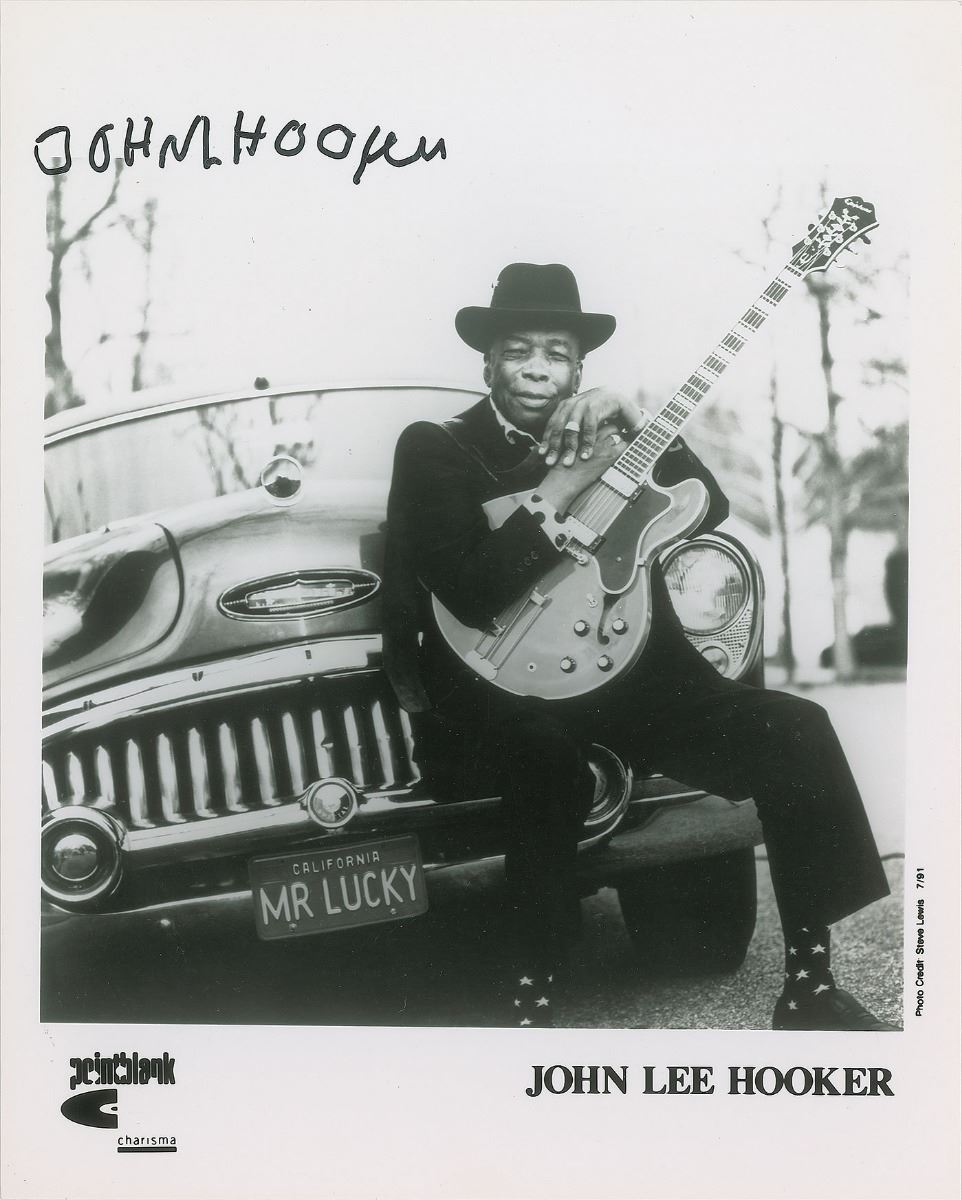 Glossy 8 x 10 Pointblank Records publicity photo of Hooker sitting on the front bumper of a car, signed across the top in black felt tip, “John L. Hooker.” In fine condition.