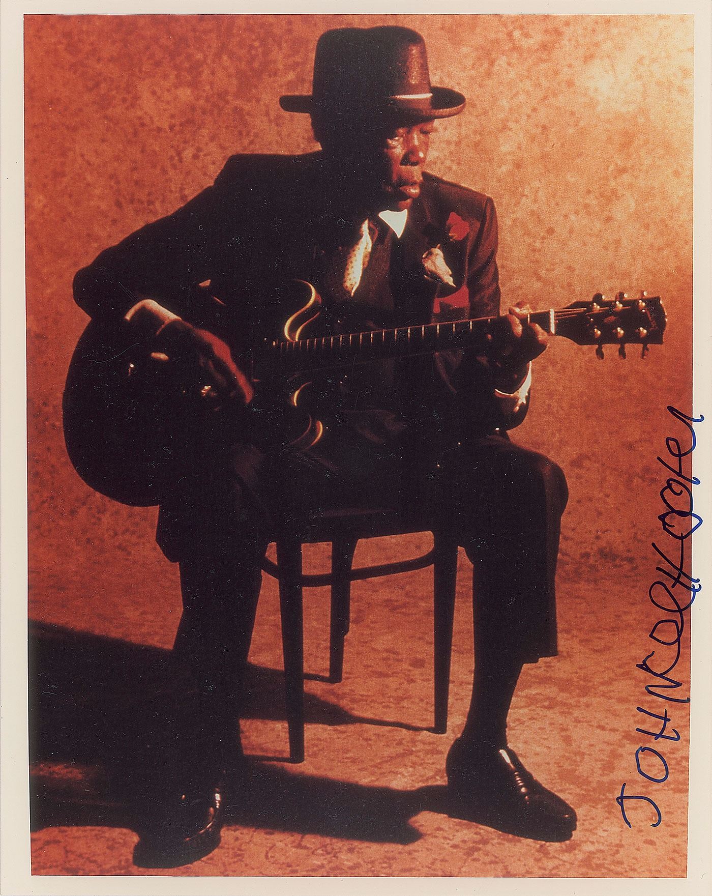 Color glossy 8 x 10 full-length photo of Hooker seated and playing the guitar, vertically signed along the right side in blue felt tip. In fine condition. Originally obtained by in-person specialist Mike Wehrmann.