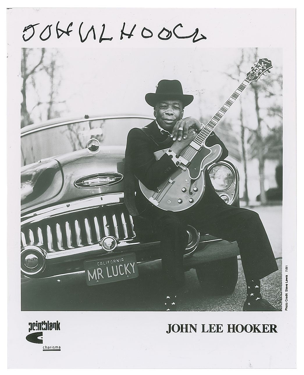 Satin-finish 8 x 10 Pointblank publicity photo of Hooker posing with his guitar in front of a classic car, signed in the upper border in black felt tip, "John L. Hooker." In very fine condition.