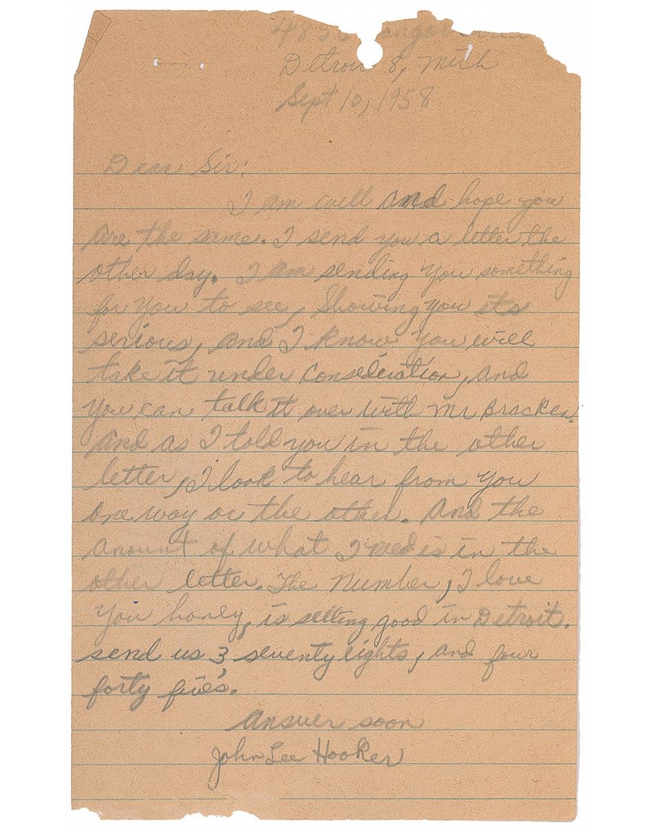 LS in pencil, one page, lightly-lined, 5 x 8, September 10, 1958. Letter to a gentleman. In part: “I am sending you something for you to see, showing you it’s serious, and I know you will take it under consideration…The number, I Love You Honey, is selling good in Detroit, send us 3 seventy eights, and four forty fives.” Some paper loss to the upper and lower edges (affecting only the address), otherwise fine condition.