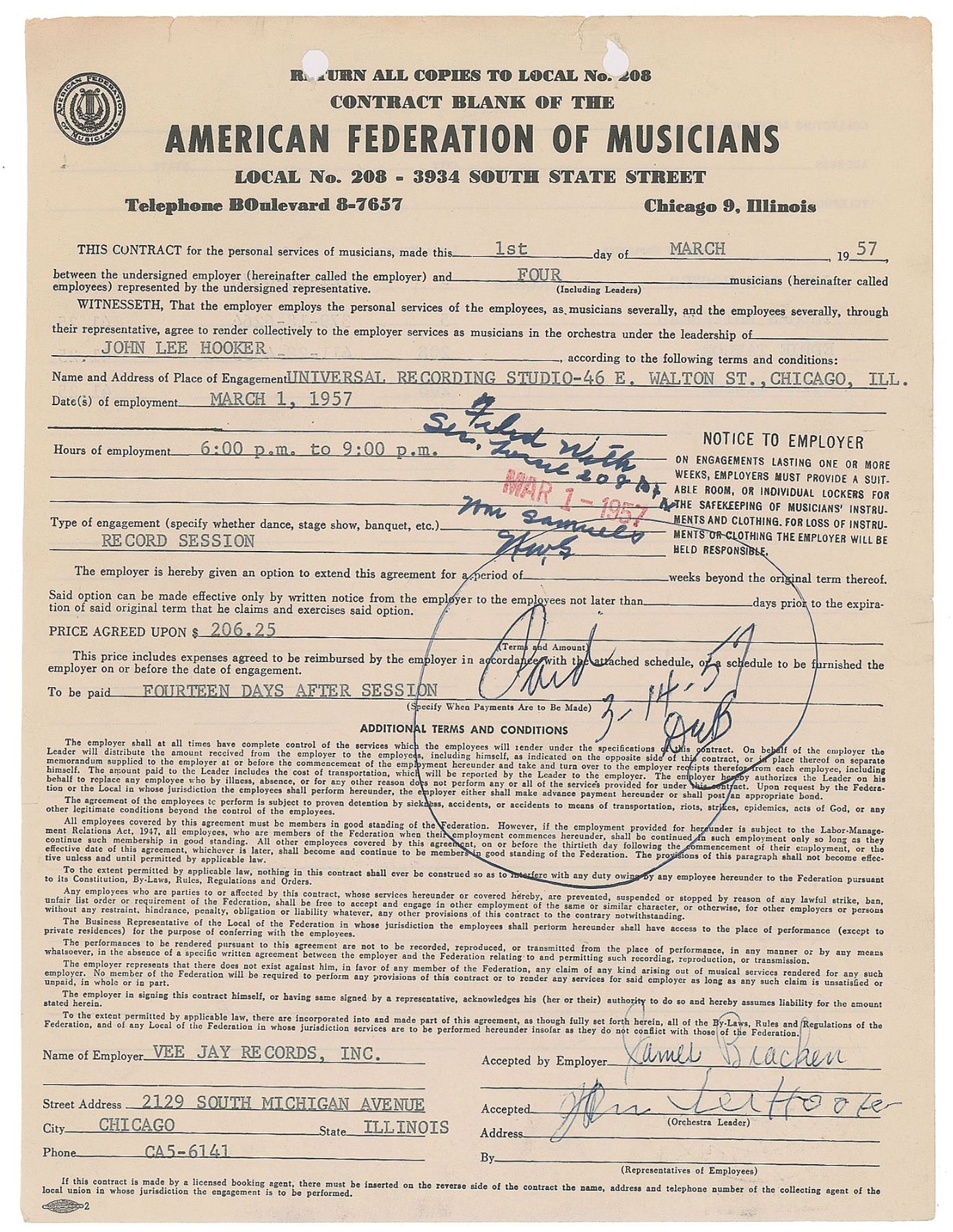 Early DS, one page, 8.25 x 11, March 1, 1957. American Federation of Musicians contract in which John Lee Hooker agrees to a three-hour recording session at Chicago's Universal Recording Studio on the same date for a sum of $206.25. Signed at the conclusion in black ballpoint by Hooker. In fine condition, with short tears to the top edge.