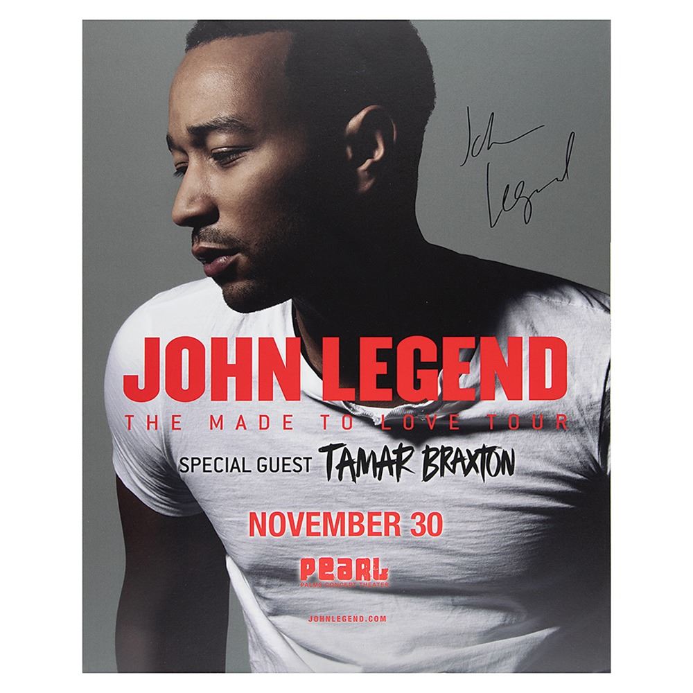 Appealing color 23 x 29.25 poster for a concert by John Legend at the Pearl Concert Theatre at the Palms Casino Resort in Las Vegas, Nevada, on November 30, 2013, as part of his ‘The Made to Love Tour,’ signed in black felt tip. Affixed to a same-size mount and in very fine condition. The consignor notes that the autograph was obtained in person.
