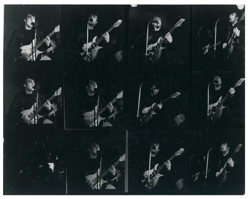 In twelve onstage close-ups captured by Jurgen Vollmer at Hamburg’s Top Ten Club in Spring ‘61, John is belting out a vocal; playing his Rickenbacker with George and Pete in the background of several of the images. Vollmer’s iconic image of Lennon in the doorway was used as the front cover of his 1974 “Rock & Roll” album. The 11 x 14” contact sheet was given to Pauline Sutcliffe by Jurgen Vollmer in 1989. EX.