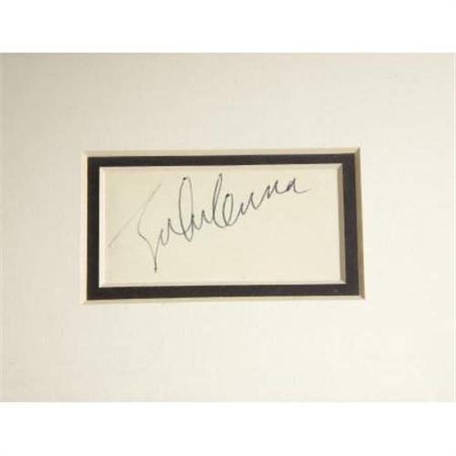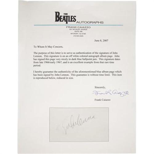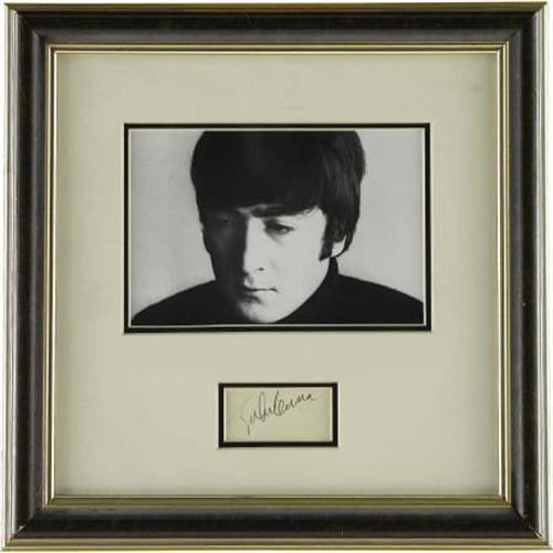 <B>John Lennon Framed Autograph.</B></I> A rare 3" x 2" signature cutting from the late Beatle in black ballpoint. In Excellent condition, matted and framed along with a b&w 7" x 5" photo of Lennon to an overall size of 13" X 13". In Excellent condition. <I>Accompanied by a COA from Frank Caiazzo.</B></I><BR><BR><b>Shipping:</b> Framed - with Glass, Small (<a target="_blank" href="http://www.heritageauctions.com/common/shipping.php">view shipping information</a>)