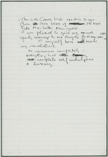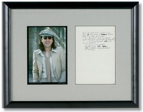 On this off white colored lined page sheet of notepaper, John has written an 11 line greeting and sentiment to his fans entitled “The Great Wok”. It reads “This is the Great Wok speakin to you from thee heart of the West Side Manhattan New York. I am pleased to give my annual yearly message to ma people for the year 1979. I myself have made my resolutions to renounce completely – everything but complete self indulgence + luxury.” The “Great Wok” appeared in a lengthier, spoken version on disc 4 of the John Lennon anthology box set. Comes with an LOA from Frank Caiazzo. 7 x 10”