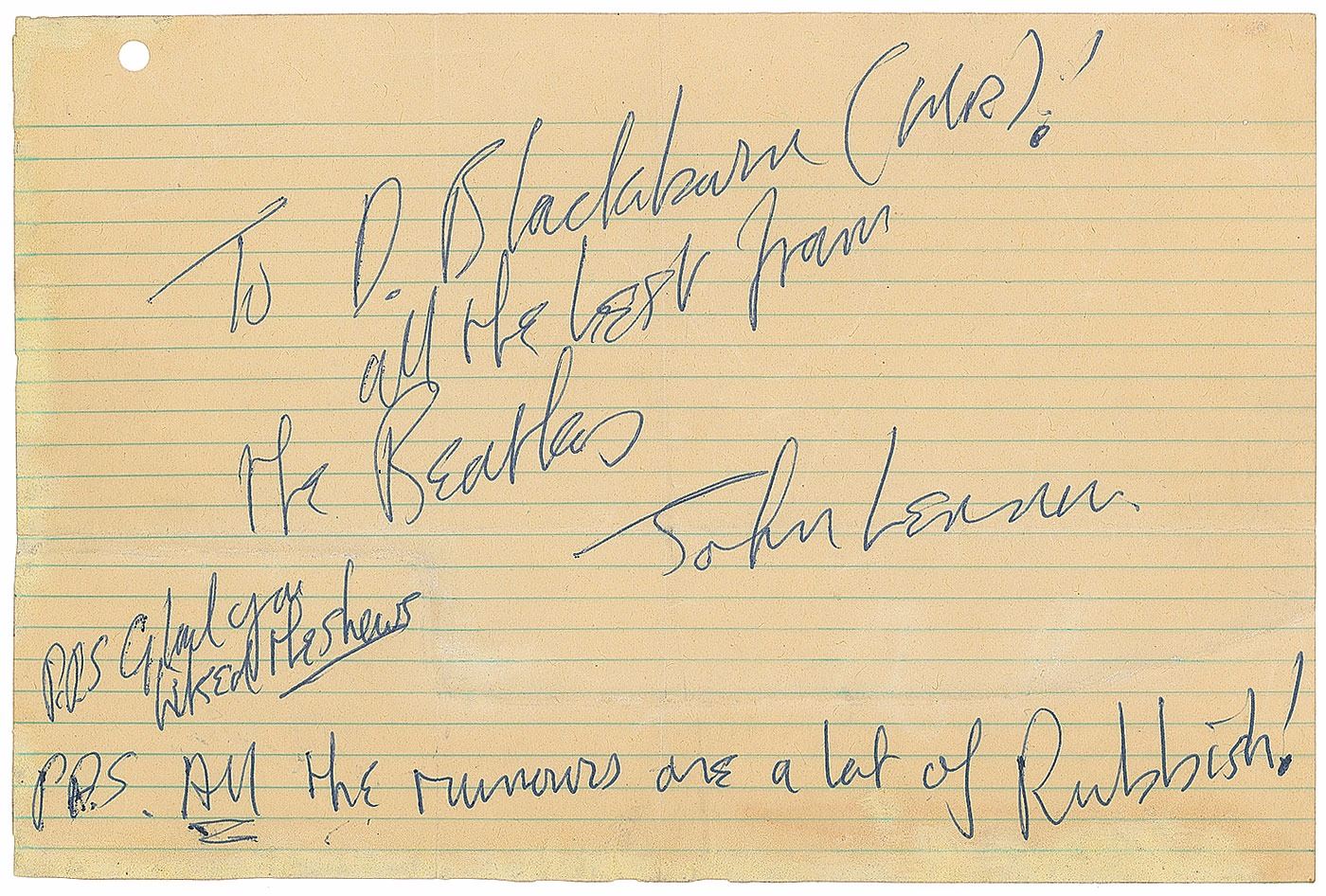 Crisply signed ANS on an off-white 8.25 x 5.5 sheet of notebook paper, in full: "To D. Blackburn (Mr)!, all the best from, the Beatles, John Lennon. P. P. S. Glad you liked the shows. P. P. S. All the rumours are a lot of Rubbish!" In very good to fine condition, with trimming, folds, creasing, and overall toning, and a quite unobtrusive expert professional repair to a onetime tear that separated the "PPS" lower section from the upper section