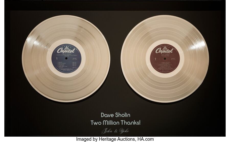 John LennonImagine/Shaved FishIn-House/Appreciation Platinum Sales Award. An in-house/appreciation award for two of John and Yoko's big albums, Imagineand Shaved Fish. According to the printing in the bottom center portion, "Dave Sholin / Two Million Thanks! / John Yoko." Both platinum discs have the Capitol logo printed on them. Housed in a shadow box and measures 2" x 18 ¼" x 29 ¼". In Very Good Plus condition with wear and smudges on the frame. COA from Heritage Auctions.