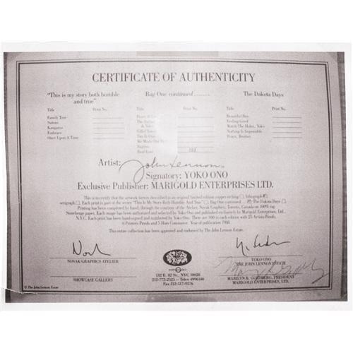 <B>John Lennon "Real Love" Lithograph Signed by Yoko Ono.</B></I> A lithograph of one of Lennon's "Real Love: The Drawings for Sean" series, #251 in a limited edition of 300, signed by Yoko Ono. Matted and framed to an overall size of 31" x 39", and in Excellent condition.<I>Accompanied by LOA from PSA/DNA.</B></I><BR><BR><b>Shipping:</b> Framed - with Glass, Large (<a target="_blank" href="http://www.heritageauctions.com/common/shipping.php">view shipping information</a>)