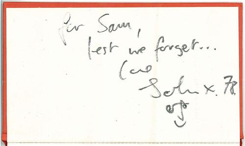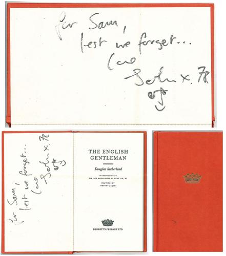 This hardback copy of “The English Gentleman” by Douglas Sutherland was presented as a gift from Lennon to a close friend in 1978. It is signed and inscribed on the flyleaf in black marker, “For Sam, lest we forget…love John x 1978”. Additionally, John has drawn a small facial caricature of himself, which is desirable and certainly adds a nice touch. Comes with an LOA from Frank Caiazzo