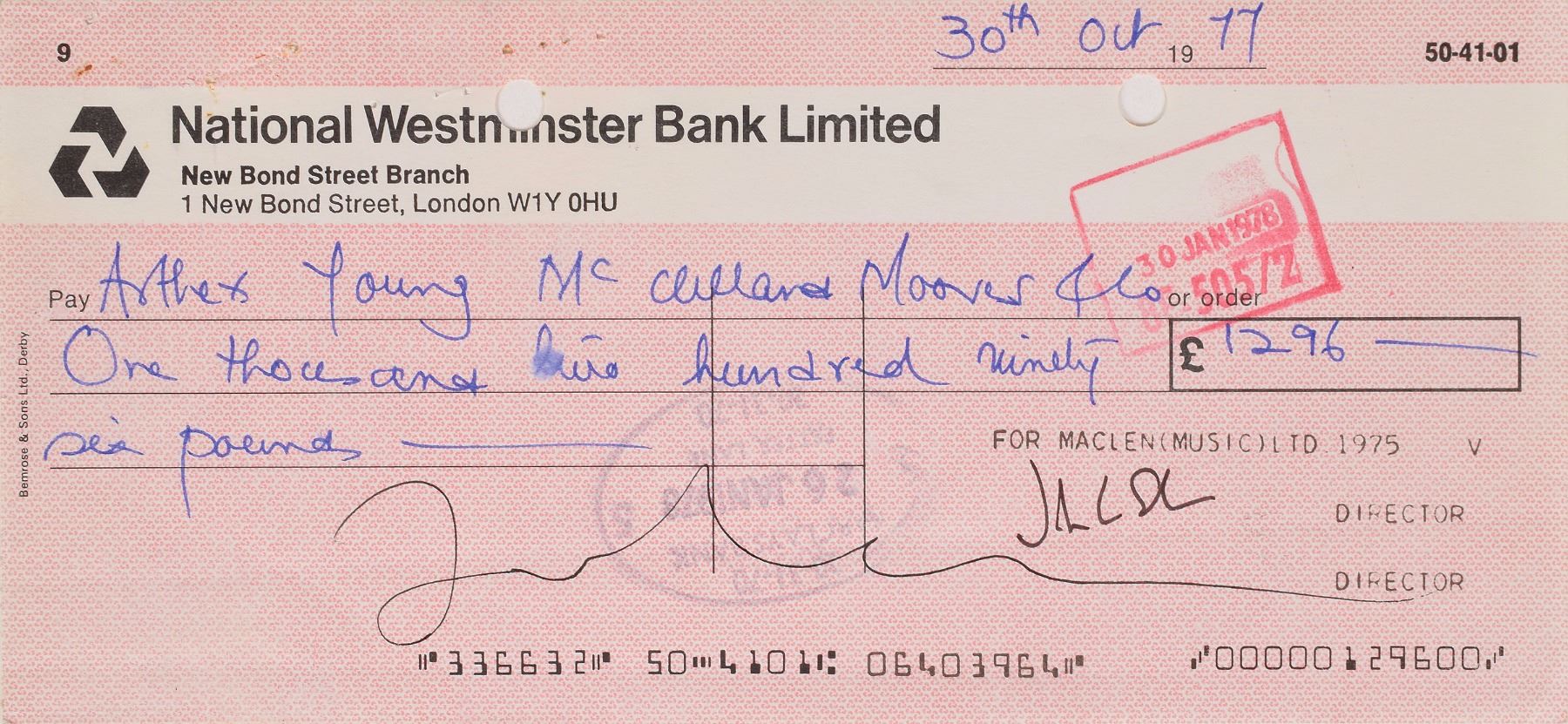 Sought-after Maclen (Music) Ltd. business check, 8 x 3.5, filled out in another hand and signed by Lennon, payable to Arthur Young McClelland Moores & Co. for £1296, October 30, 1977. In fine condition, with staple holes to the top edge. Lennon departed his solo musical career after the birth of his second child Sean in 1975. His role as 'househusband' and his subsequent musical hiatus lasted until 1980 and the release of his final studio album, Double Fantasy; he was shot and killed a month after its release. An attractive example with a massive Lennon signature.
