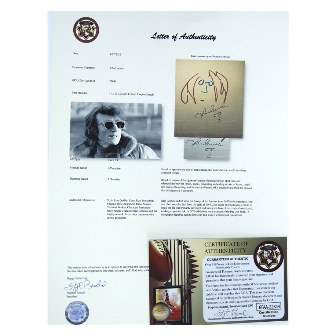John Lennon (October 9, 1940 – December 8, 1940). John Lennon signed Imagine Sketch. Signed Boldly in Black Ink below sketch with caricature below signature. Colorful red, purple, green and blue caricature hand-drawn by John Lennon. John Lennon’s artwork celebrates human love and communication – two themes at the heart of his contribution to the art of the twentieth century. His iconic Self-Portrait image has become the cornerstone of his art. While music will be remembered as his most popular art form, he loved both literature and his visual art, studying at Liverpool Art Institute from 1957-1960. He penned and illustrated three books: In His Own Write, A Spaniard in the Works, and Skywriting by Word of Mouth. Born and raised in Liverpool, England, as a teenager John Lennon became involved in music, forming his first band, the Quarrymen, which by 1960 had evolved into The Beatles, the most commercially successful band in the history of popular music. Lennon was a visual artist before he picked up his first guitar or wrote his first song. He attended the prestigious Liverpool Art Institute (1957-1960). He continued to draw throughout his life. Lennon’s primary medium was line drawing, either in pen, pencil, or Japanese sumi ink. This item has been professionally custom matted and framed. Comes with a Letter of Authentication from Guaranteed Forensic Authenticators, along with the GFA guarantee of authenticity.