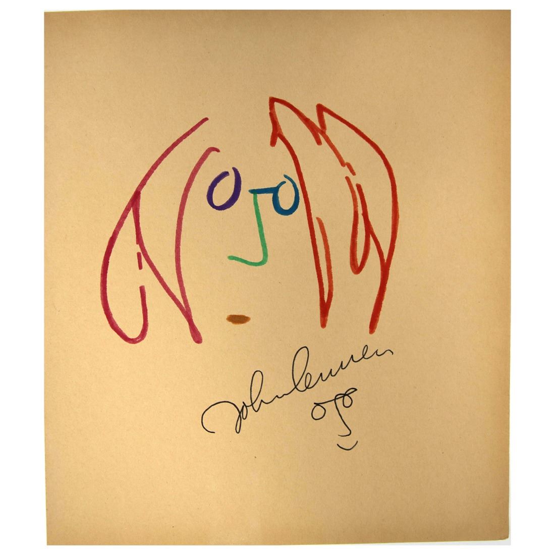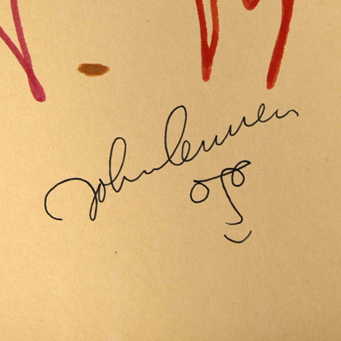 John Lennon (October 9, 1940 – December 8, 1940). John Lennon signed Imagine Sketch. Signed Boldly in Black Ink below sketch with caricature below signature. Colorful red, purple, green and blue caricature hand-drawn by John Lennon. John Lennon’s artwork celebrates human love and communication – two themes at the heart of his contribution to the art of the twentieth century. His iconic Self-Portrait image has become the cornerstone of his art. While music will be remembered as his most popular art form, he loved both literature and his visual art, studying at Liverpool Art Institute from 1957-1960. He penned and illustrated three books: In His Own Write, A Spaniard in the Works, and Skywriting by Word of Mouth. Born and raised in Liverpool, England, as a teenager John Lennon became involved in music, forming his first band, the Quarrymen, which by 1960 had evolved into The Beatles, the most commercially successful band in the history of popular music. Lennon was a visual artist before he picked up his first guitar or wrote his first song. He attended the prestigious Liverpool Art Institute (1957-1960). He continued to draw throughout his life. Lennon’s primary medium was line drawing, either in pen, pencil, or Japanese sumi ink. This item has been professionally custom matted and framed. Comes with a Letter of Authentication from Guaranteed Forensic Authenticators, along with the GFA guarantee of authenticity.