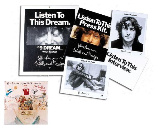 1974. Included here: 1) very scarce “Walls & Bridges” press kit includes a “Listen To This Interview” sheet; 8 x 10” “Listen To This Photo” (two), and a “Listen To This Press Kit” folder. Photos and interview are NRMT, folder has spine wrinkles; 2) cardboard display with hanging eyelet, 13 x 16”, NRMT., and 3) sealed copy of the “Walls & Bridges” album!