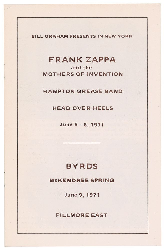 Fillmore East program for a pair of Frank Zappa and the Mothers of Invention concerts on June 5-6, 1971, and a Byrds concert on June 9, 1971, eight pages, 5.5 x 8.5, which also promotes performances by the Hampton Grease Band, Head Over Heels, and McKendree Spring. The Zappa concert on June 6th turned into a jam of legendary proportions when John Lennon, who met Zappa earlier that day and was then playing with the Plastic Ono Band, stunned the Fillmore audience when he and Yoko Ono shared the stage with Zappa for a four-song set that included 'Well (Baby Please Don’t Go),' 'Jamrag,' (which is actually 'King Kong'), 'Scumbag,' and 'u,' which was also known as 'Aü.' In fine condition. The four songs recorded at the Fillmore East ended up on Lennon's Some Time in New York City album. Accompanied by a modern photo of Lennon, Ono, and Zappa performing at the concert.