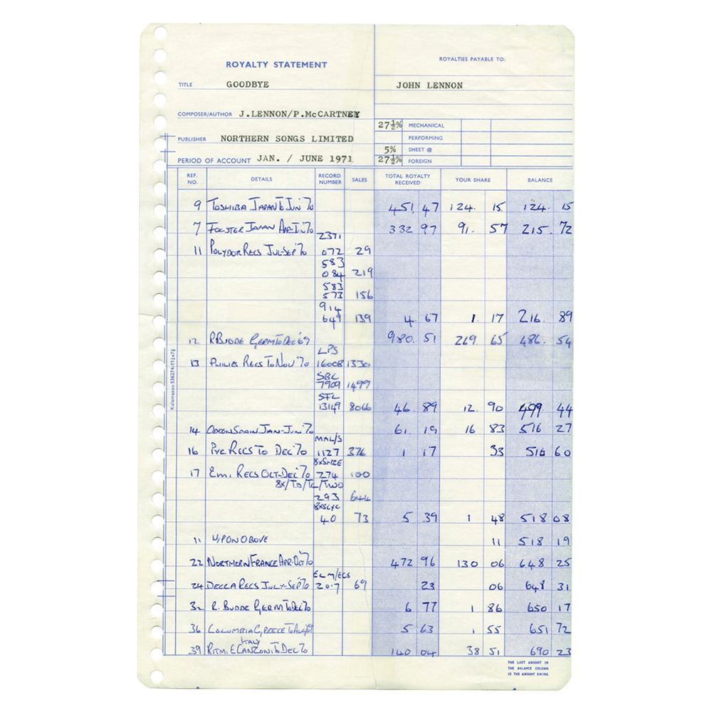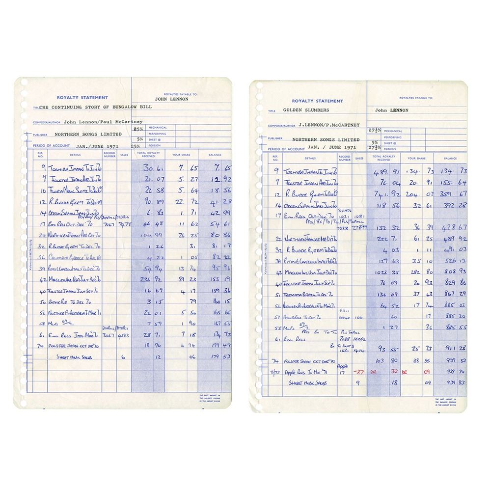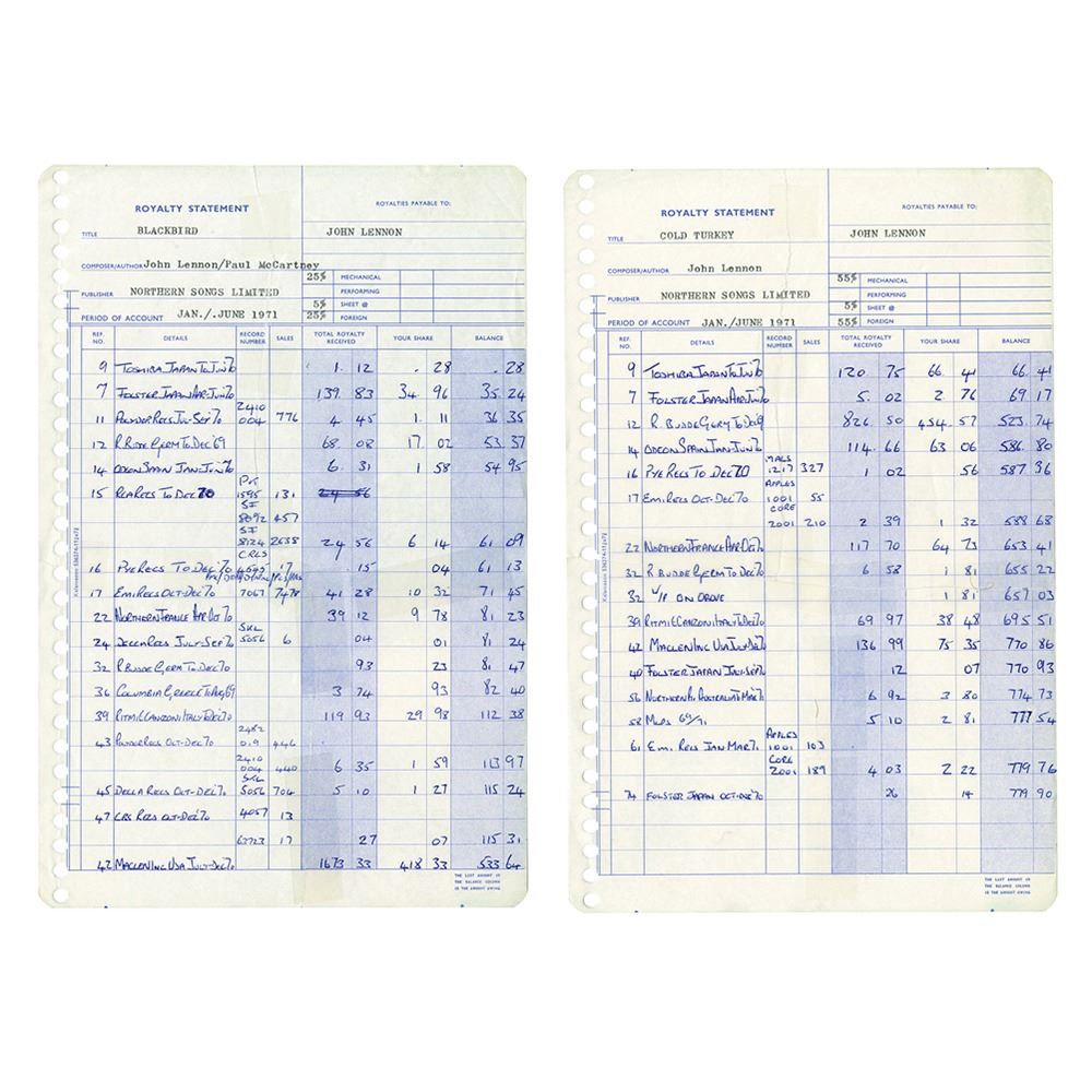 Set of five royalty statements issued to John Lennon for the period of January to June 1971 for the Beatles songs ‘Blackbird,’ ‘Cold Turkey,’ ‘The Continuing Story of Bungalow Bill,’ ‘Golden Slumbers,’ and ‘Goodbye,’ with four listing Lennon and Paul McCartney as the “Composer/Author,†and one (‘Cold Turkey’) listing only Lennon. Each of the five sheets, 7.25 x 11.25, detail payments for sales from various countries. In overall very good to fine condition, with each sheet torn in half and taped back together. Accompanied by a certificate of authenticity from Tracks.