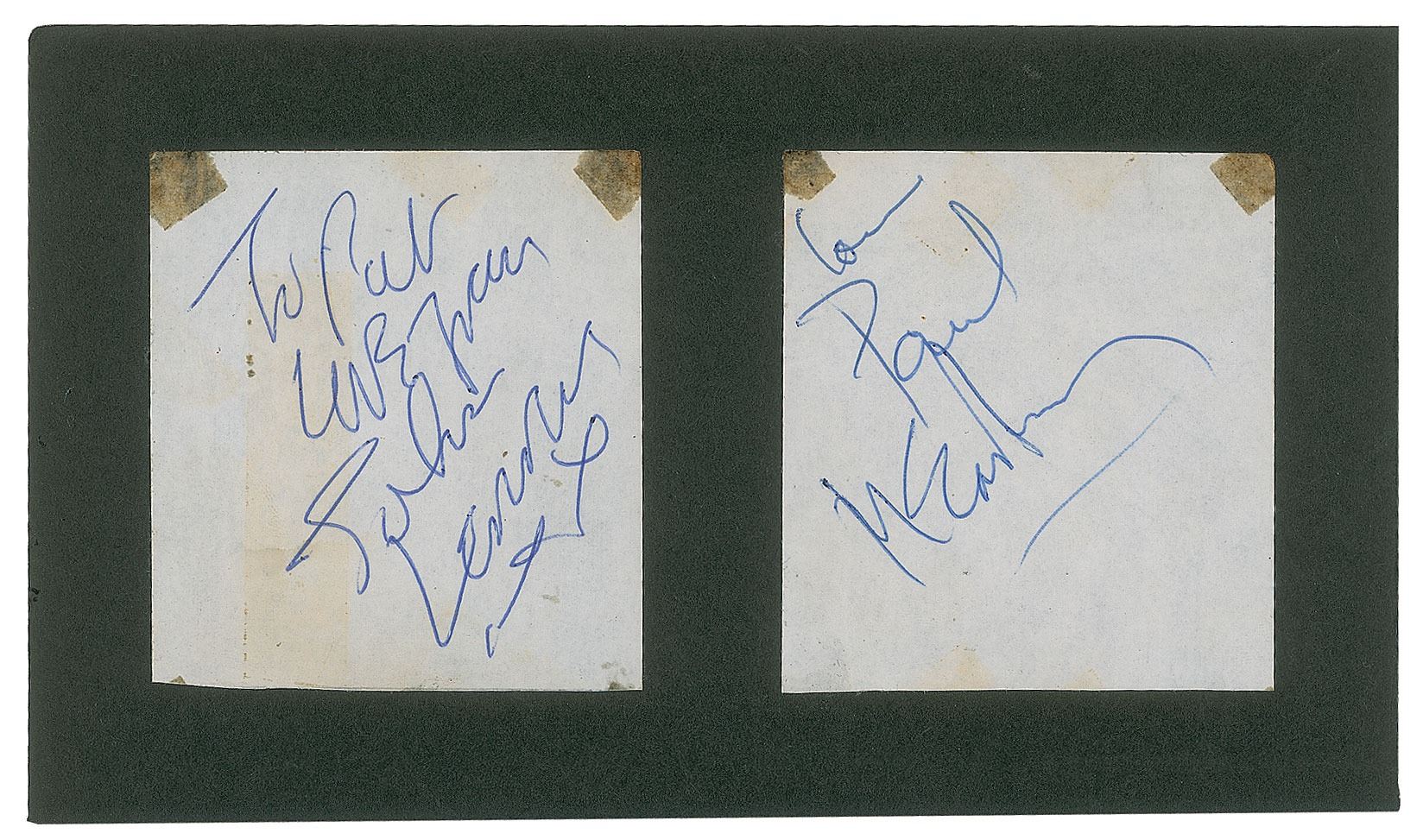 Vintage ballpoint signatures, "To Pat, love from John Lennon, xx," and "Love, Paul McCartney," on individual off-white 2.5 x 2.75 slips, affixed to a larger black 6.75 x 4 card. In very good to fine condition, with some light toning, and tape stains to the upper corners.