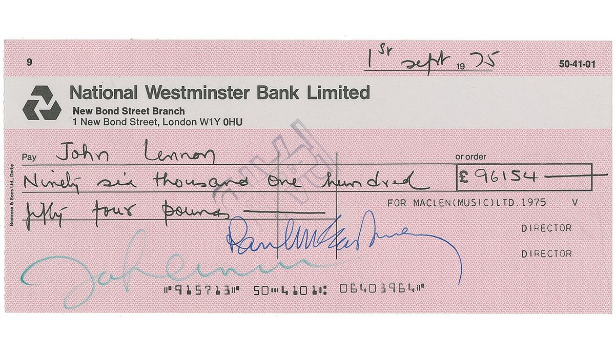 Maclen (Music) Ltd. business check, 7.75 x 3.5, filled out in another hand and signed in green felt tip, “John Lennon,” and in blue ballpoint, “Paul McCartney,” payable to John Lennon for £96,154.0.0, September 1, 1975. In fine condition, with a bank stamp to the center, trivial ding to top edge, and a few creases. Having split up in 1970, the world’s most popular song writing duo was rumored to be planning a collaboration in early 1975. The proposed visit was to take place in New Orleans, where McCartney was working on Wings’ Venus and Mars album. Lennon was still on his ‘lost weekend’ with May Pang. Unfortunately, Lennon had to postpone the trip and the reunion never took place. A fantastic post-breakup example from the legendary song writing duo.