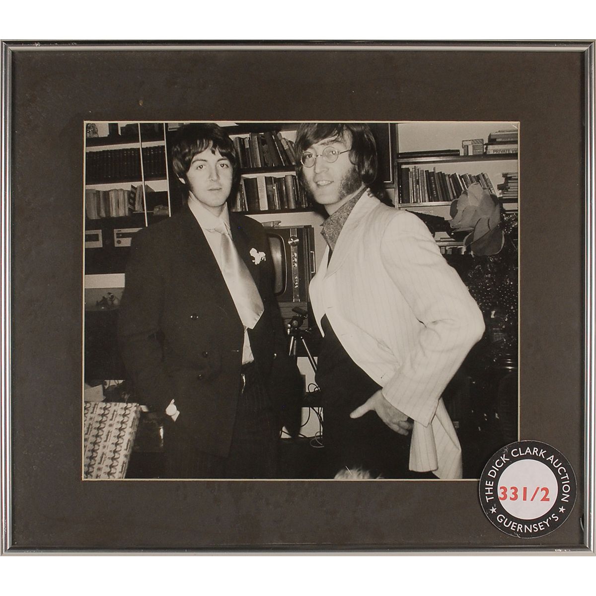 Original unsigned pearl-finish 11 x 9 photo of Lennon and McCartney, matted and framed to an overall size of 15 x 13. In very good to fine condition, with scattered overall creases. Originates from Dick Clark's personal collection and was once on display in his office. Provenance: Guernsey's, 2007.