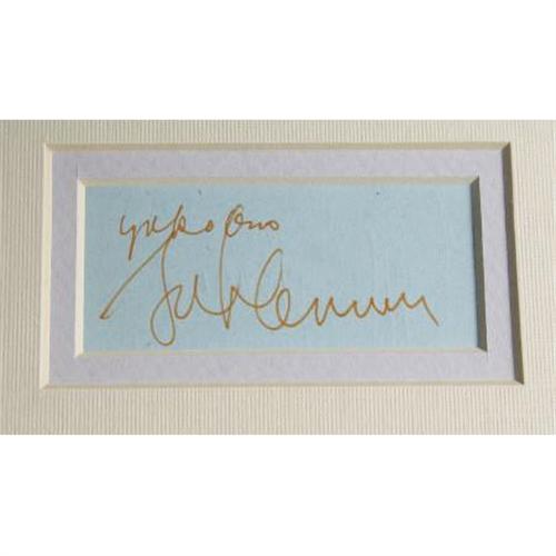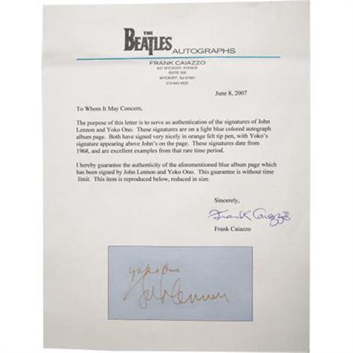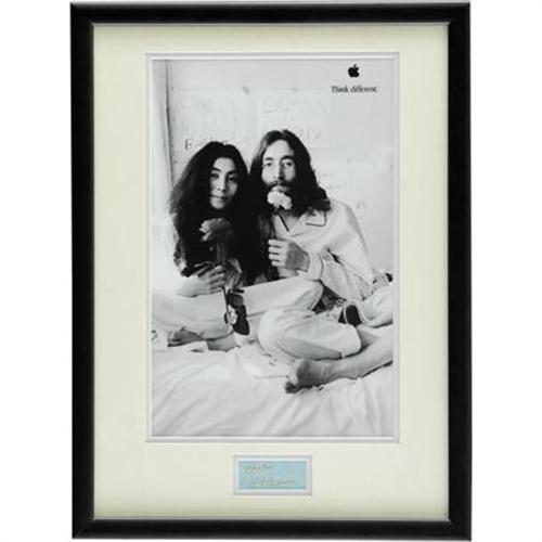 <B>John Lennon and Yoko Ono Framed Autographs.</B></I> A blue autograph page signed by both Lennon and Ono in red ink, matted and framed along with a b&w 11" x 17" advertisement featuring two, from Apple Computers' "Think Different" campaign, to an overall size of 17" x 23.5". Lennon's autograph is a rare item, and his signature with Ono's on the same item is an added bonus. In Excellent condition. <I>Accompanied by a COA from Frank Caiazzo.</B></I><BR><BR><b>Shipping:</b> Framed - with Glass, Medium (<a target="_blank" href="http://www.heritageauctions.com/common/shipping.php">view shipping information</a>)