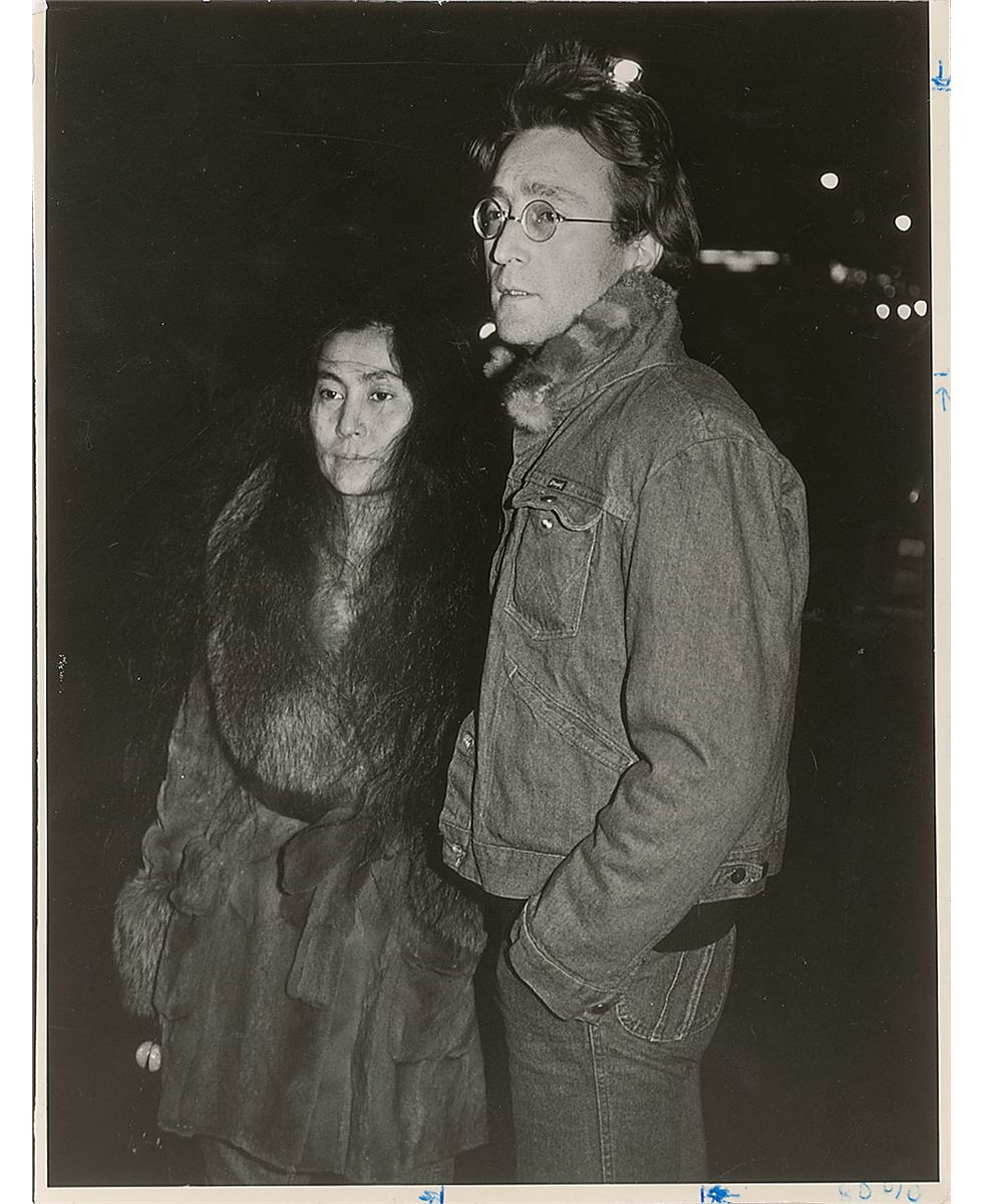 Original unsigned 1976 glossy 9 x 11.5 photo of Lennon and Ono together outdoors, by George Tebbens. Reverse bears original news stamps, notations, and tags. In fine condition, with a few light surface creases and dings to corner tips, and original production notations to the borders.