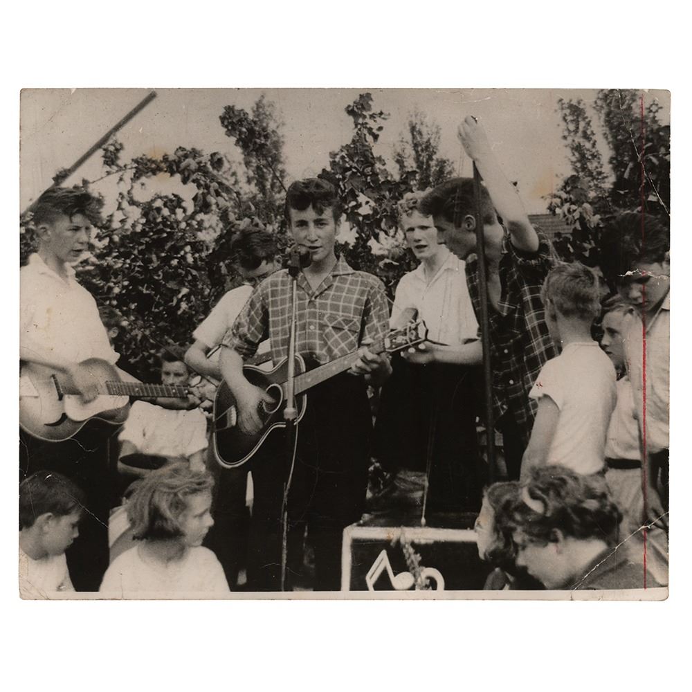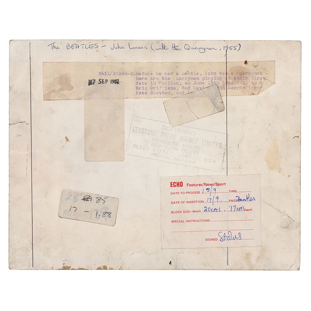 Extremely rare vintage 1960s glossy 10 x 8 wire photo of a 16-year-old John Lennon performing with his group, the Quarrymen, at the St. Peter’s Church ‘Garden Fete’ on Church Road in Woolton, Liverpool, England, on July 6, 1957, perhaps one of the most historic dates in Beatles history. During the evening, Lennon’s bandmate, Ivan Vaughan, introduced him to his fellow classmate from the Liverpool Institute, 15-year-old Paul McCartney. Reverse bears a “Keystone Press Agency Limited” copyright stamp and a few affixed labels and captions. In good to very good condition, with heavy overall creasing and a tear to the right edge. Accompanied by a certificate of authenticity from Tracks.