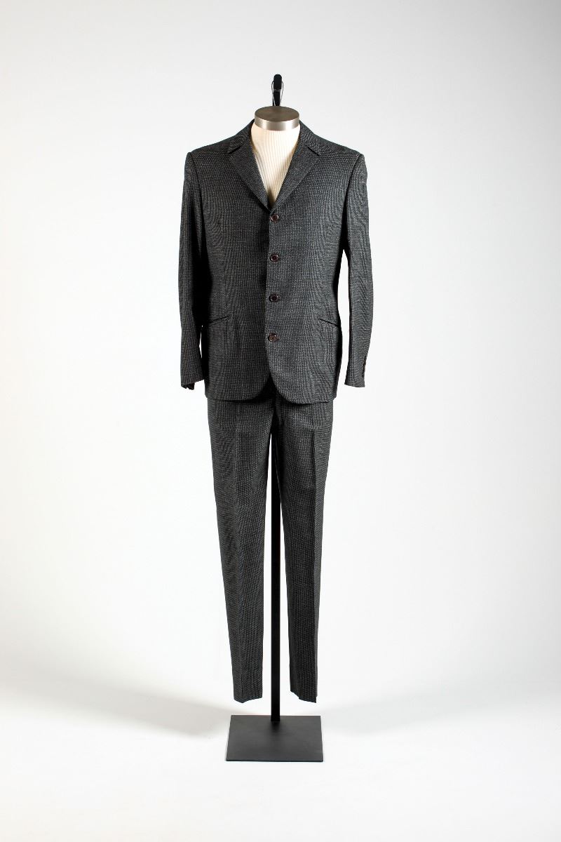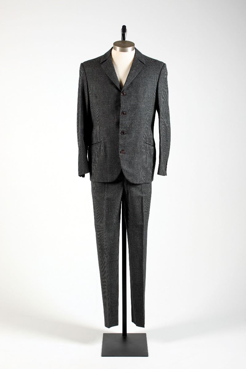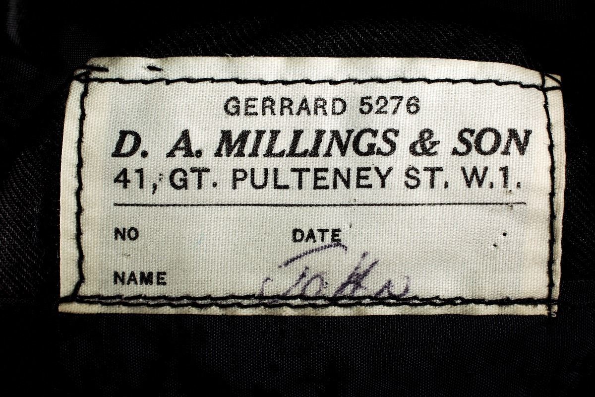 This is a custom-made, grey and black tweed hounds tooth two-piece suit created by noted Beatles tailor Douglas Millings. The jacket bears a black and silver embroidered D. A. Millings & Son logo label affixed to the interior lining of the jacket. The interior breast pocket contains a white D.A. Millings & Sons tag with “John” handwritten on the label. The trousers are finely finished with “John” handwritten twice on the interior lining below the zipper.