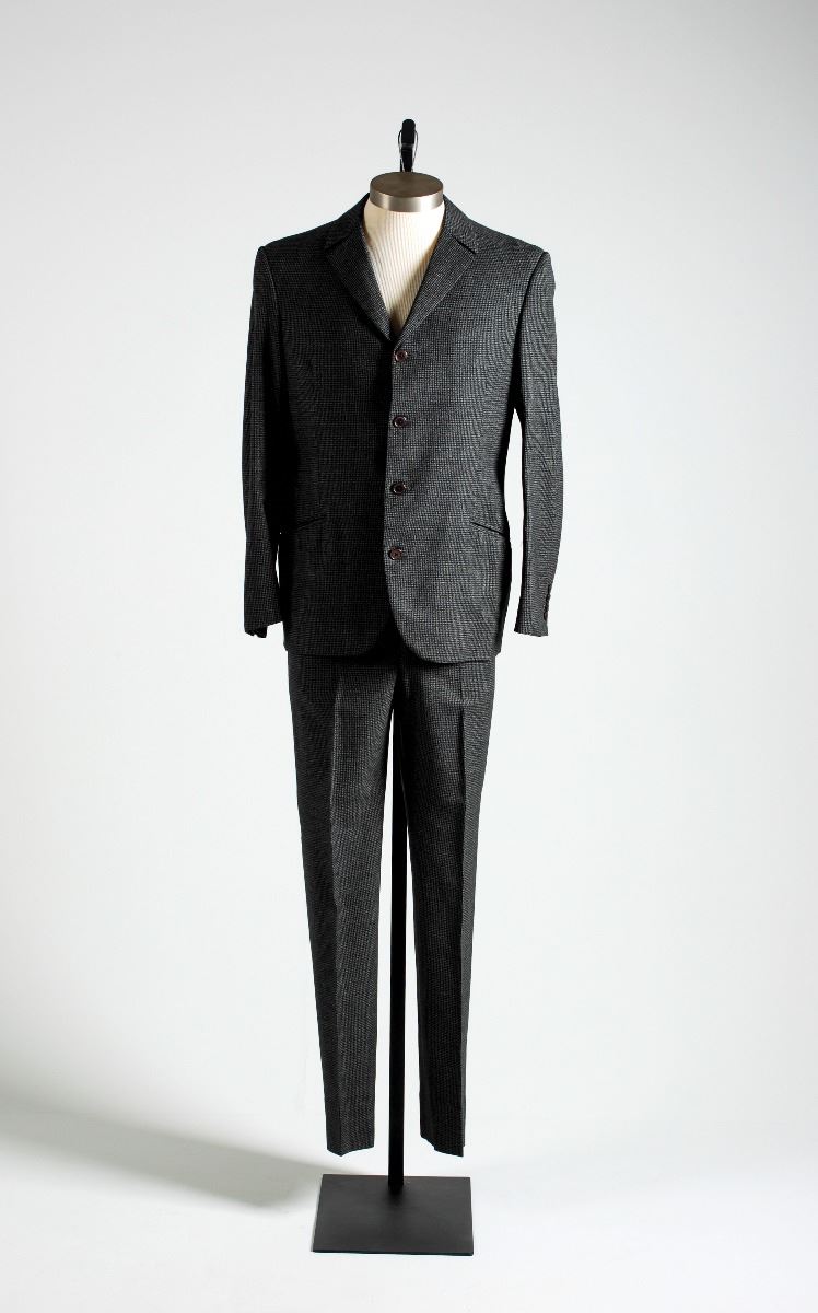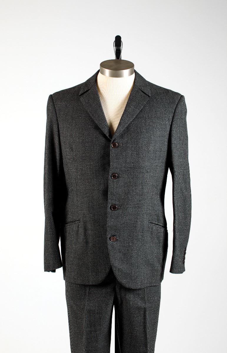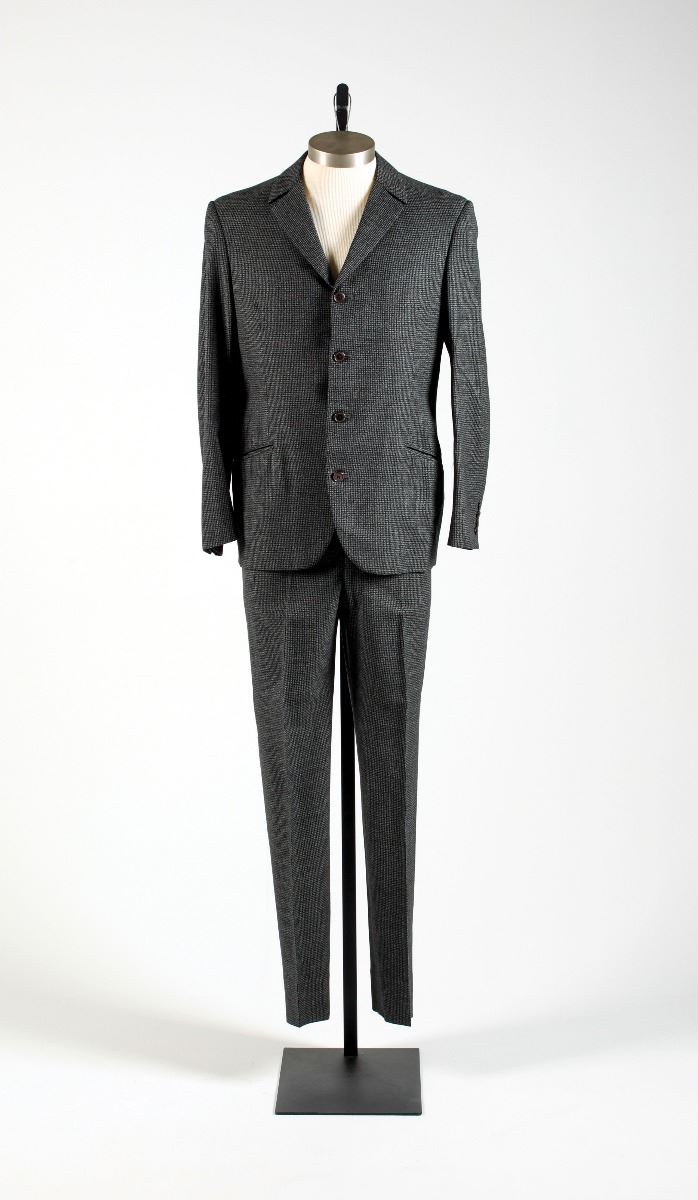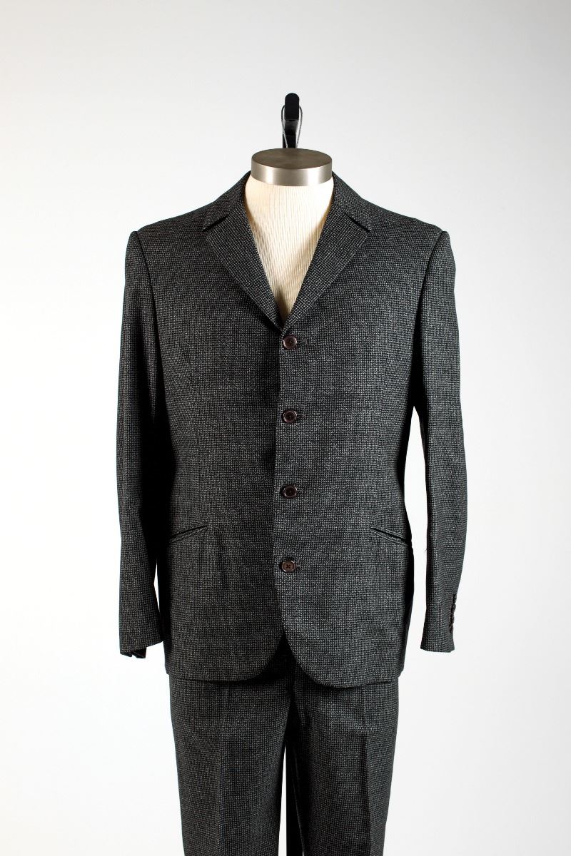 This is a custom-made, grey and black tweed hounds tooth two-piece suit created by noted Beatles tailor Douglas Millings. The jacket bears a black and silver embroidered D. A. Millings & Son logo label affixed to the interior lining of the jacket. The interior breast pocket contains a white D.A. Millings & Sons tag with “John” handwritten on the label. The trousers are finely finished with “John” handwritten twice on the interior lining below the zipper.
